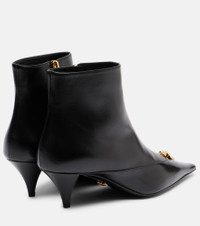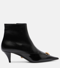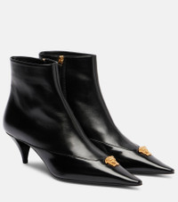 Inspired by Greek mythology, the Medusa head has become the ultimate signifier of the house of Versace. Here in gold, it adorns the vamps of these sleek ankle boots, crafted from leather and featuring 55mm heels. Product Details - Upper: calf leather - Lining: leather - Sole: leather insole and sole - Toe shape: pointed toe - Made in Italy - Includes: shoe box, dust bags - Designer color name: Black+Versace Gold - Item color: black - Hardware color: gold - Closure: zipped side - Item number: P01083884 Size & Fit - True to size - European sizes - 5,5cm-2" heel (size EU 38)