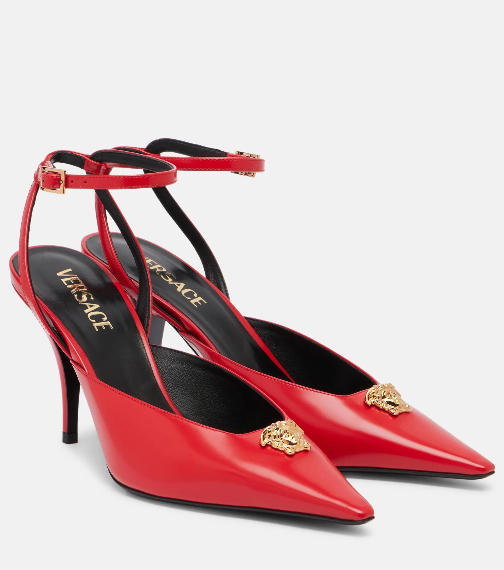 Expertly crafted from smooth leather, the La Medusa slingback pumps from Versace deserve a spot in your sophisticated footwear rotation. This pair features 85mm stiletto heels and stays true to house codes with the iconic embellishments on the uppers. Product Details - Upper: calf leather - Lining: leather - Sole: leather insole and sole - Toe shape: pointed toe - Made in Italy - Includes: shoe box - Designer color name: Red-Versace Gold - Item color: red - Closure: buckle-fastening ankle strap - Item number: P01083879 Size & Fit - True to size - European sizes - 8,5cm-3.5" heel (size EU 38)