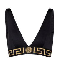 Add an ornate touch to your poolside edit with this black bikini top from Versace. It's made from stretch-swim fabric that provides a sculpting fit and comes trimmed with the house's Greek key pattern, a motif so iconic that it's known far outside fashion circles. Complete your look with the coordinating briefs. Product Details - Made in Italy - Lining: 22% elastane, fully lined, 78% polyamide - Trim: 9% polyamide, 9% elastane, 82% polyester - Designer color name: Nero - Care instructions: hand wash - Material: 78% polyamide, 22% elastane - Item number: P00533116 Size & Fit - True to size - Cup size: A/B - If you wear a C cup or bigger, we recommend trying one size larger - The model seen in the picture is 178cm-5'10", cup size B, and wearing a size 1