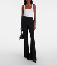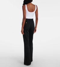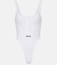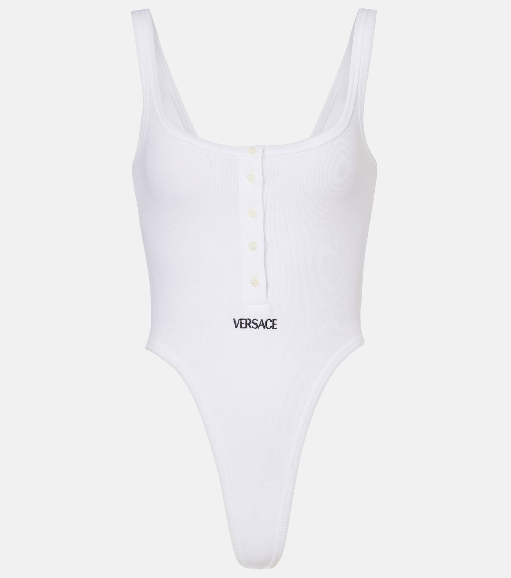 Leisurely days are stylish in this high-cut bodysuit from Versace. The ribbed-knit design features the brand’s logo and a buttoned placket inspired by Henley shirts. Product Details - Material: 95% cotton, 5% elastane - Care instructions: hand wash - Made in Italy - Designer color name: Optical White - Item color: white - Embroidery: 100% polyester - Closure: buttoned placket, snap-buttoned fastenings - Collar: crewneck - Item number: P01069634 Size & Fit - True to size - Low back - Semi-sheer - Fitted - Stretchy fabric - High-cut leg - The model seen in the picture is 178cm-5'10" and wearing a size 1
