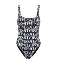 Show your love for Versace with this black swimsuit: it features an all-over white logo print for easy recognition. Product Details - Material: 78% polyester, 22% elastane - Lining: fully lined, 25% elastane, 75% polyamide - Made in Italy - Care instructions: hand wash - Item number: P00731554 Size & Fit - True to size - High-cut leg - The model seen in the picture is 178cm-5'10", cup size B, and wearing a size 1 - Unpadded Top