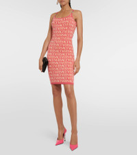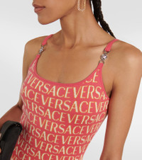 This minidress from Versace is made to a fitted silhouette from a cotton blend and adorned with all-over logo lettering. The scoop-neck style is framed by spaghetti straps featuring hardware Medusa '95 embellishments. Product Details - Made in Italy - Material: 59% cotton, 41% viscose - Care instructions: machine wash at 30 degrees - Item number: P00837107 Size & Fit - Fits large to size - we recommend trying one size smaller - Fitted - Mid-weight material - Stretchy fabric - The model seen in the picture is 178cm-5'10" and wearing a size IT 38