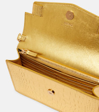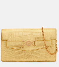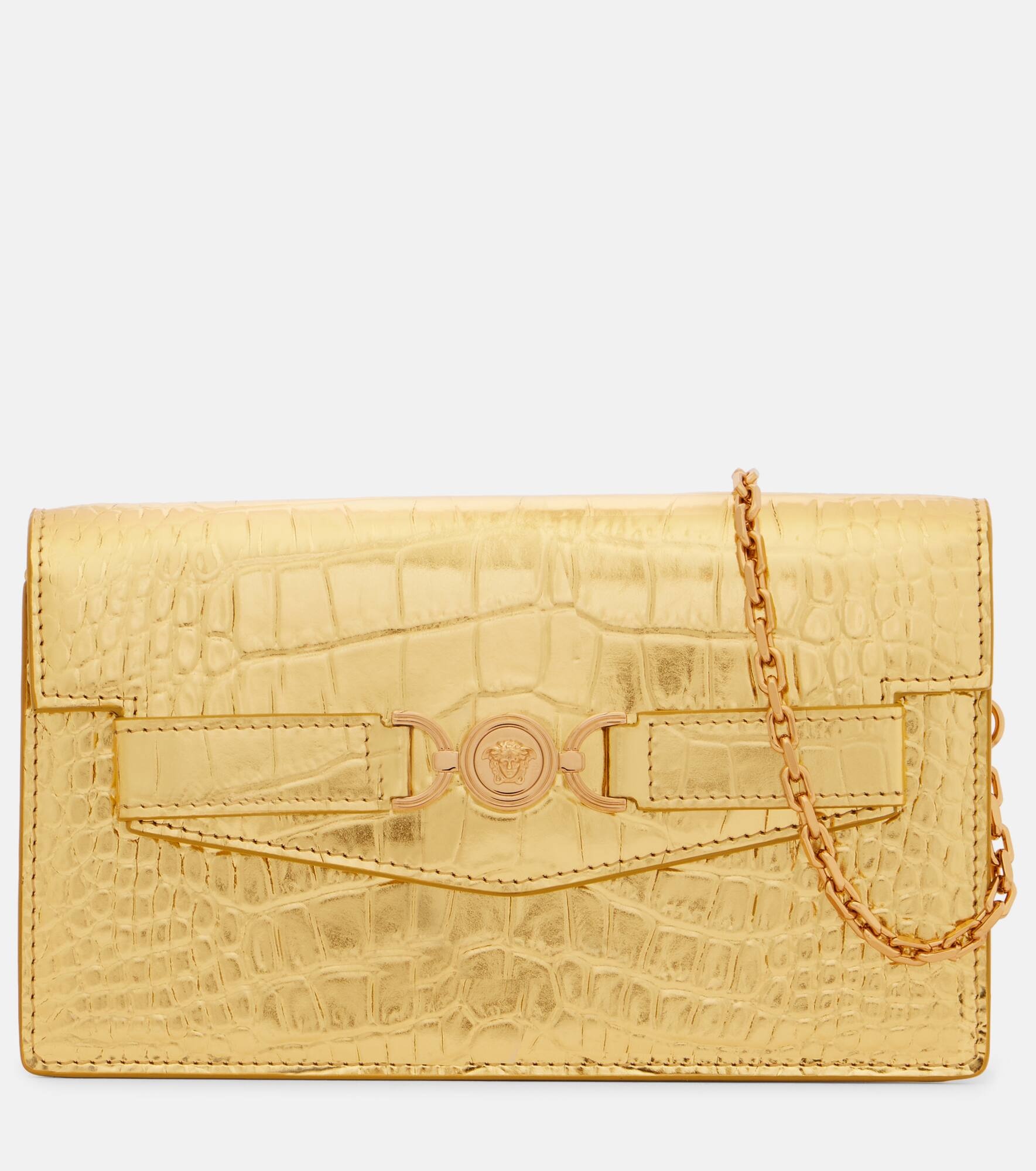 Crafted from metallic leather, the Medusa '95 shoulder bag from Versace features a structured silhouette with a detachable chain shoulder strap. The design is complete with the brand's iconic gold-tone motif at the front for a signature touch. Product Details - Material: leather - Lining: leather - Made in Italy - Designer color name: Gold-Versace Gold - Item color: gold - Color of chain strap: gold - Detachable chain shoulder strap - Hardware color: gold - Closure: magnetic fastening - Internal details: single compartment, Card slots, internal zipped pocket - Includes: dust bag - Item number: P01064030 Size & Fit - Height 11.5cm-4.5" - Width 20cm-8" - Depth 3cm-1" - Chain length 107cm-42"