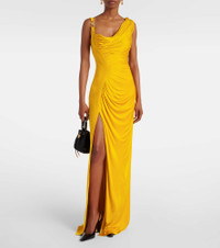 The Medusa '95 gown from Versace has an asymmetric neckline and features draped pleating. Inspired by Greek mythology, the Medusa head has become the ultimate signifier of the house of Versace. Product Details - Material: 100% viscose - Care instructions: dry clean - Made in Italy - Designer color name: Marigold - Item color: gold - Material II: 74% viscose, 26% acetate - Lining II: 74% viscose, 26% acetate - Lining: 100% viscose - Item number: P01069644 Size & Fit - True to size - Cinched waist - Non-stretchy fabric - The model seen in the picture is 178cm-5'10" and wearing a size IT 40