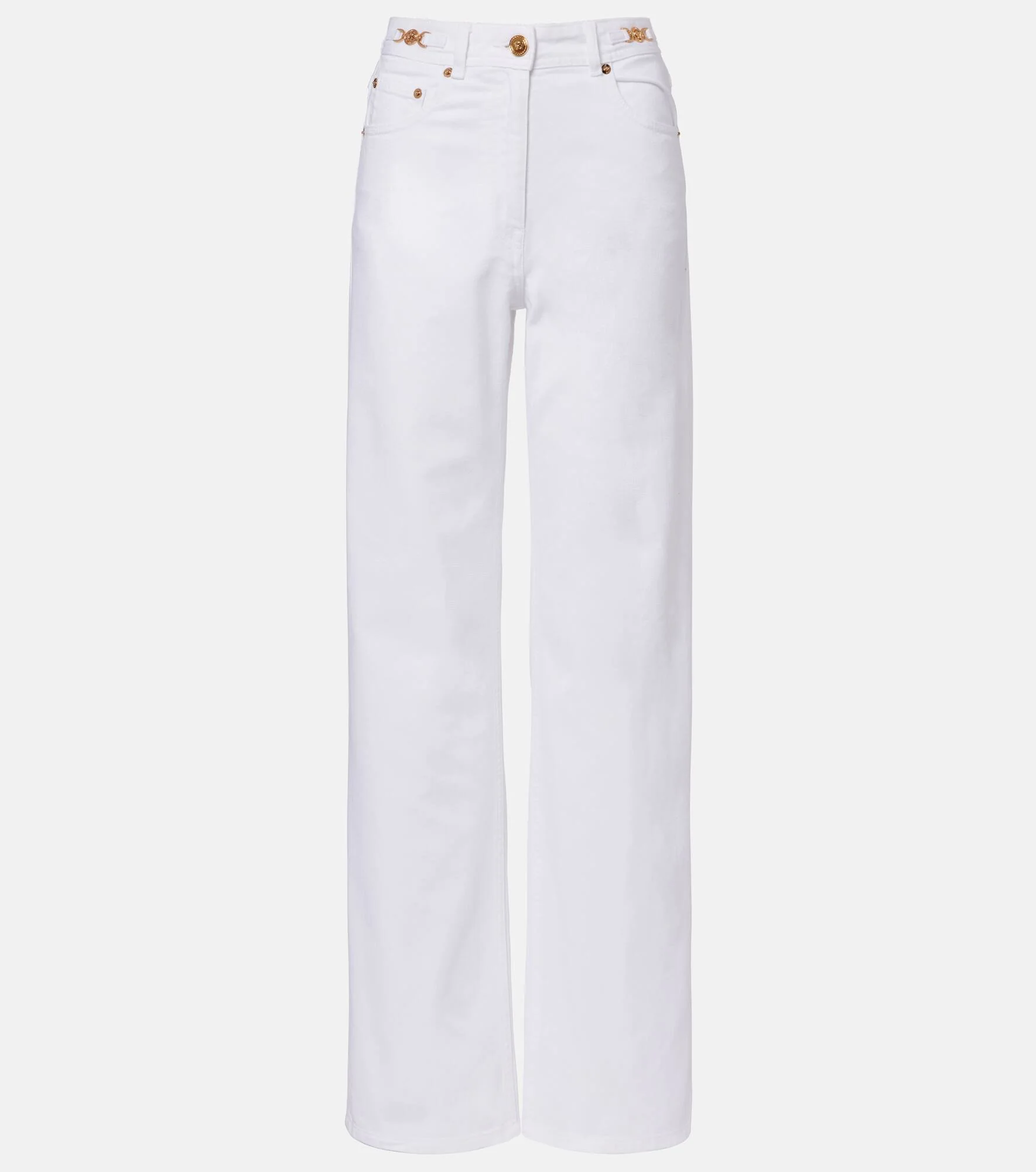 Inspired by Greek mythology, the Medusa head has become the ultimate signifier of the house of Versace. These straight jeans feature the iconic motif as a hardware detail at the fastening as well as a logo leather patch at the back. Product Details - Material: 100% cotton - Care instructions: machine wash at 30 degrees - Made in Tunisia - Color: white - Designer color name: White - Item color: white - Hardware color: gold - Details: 100% calf leather - Contains non-textile parts of animal origin - Belt loops - Pockets: five pockets - Closure: zipper fly, button fastening - Item number: P01129284 Size & Fit - Fits small to size - we recommend trying one size larger - Non-stretchy fabric - Straight leg - Mid-rise - The model seen in the picture is 178cm-5'10" and wearing a size 27