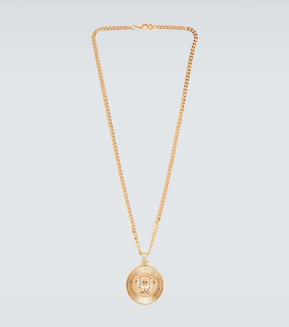 Made from 100% metal, this runway-featured necklace from Versace has a large pendant engraved with the label's Medusa Biggie motif in tribute to the rap legend. Product Details - Closure: lobster-clasp fastening - Material: brass - Made in Italy - Item number: P00737795 Size & Fit - Length when open 73cm-28.5" - Pendant length 5cm-2" - Pendant width 5cm-2"