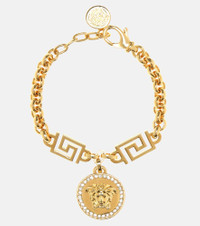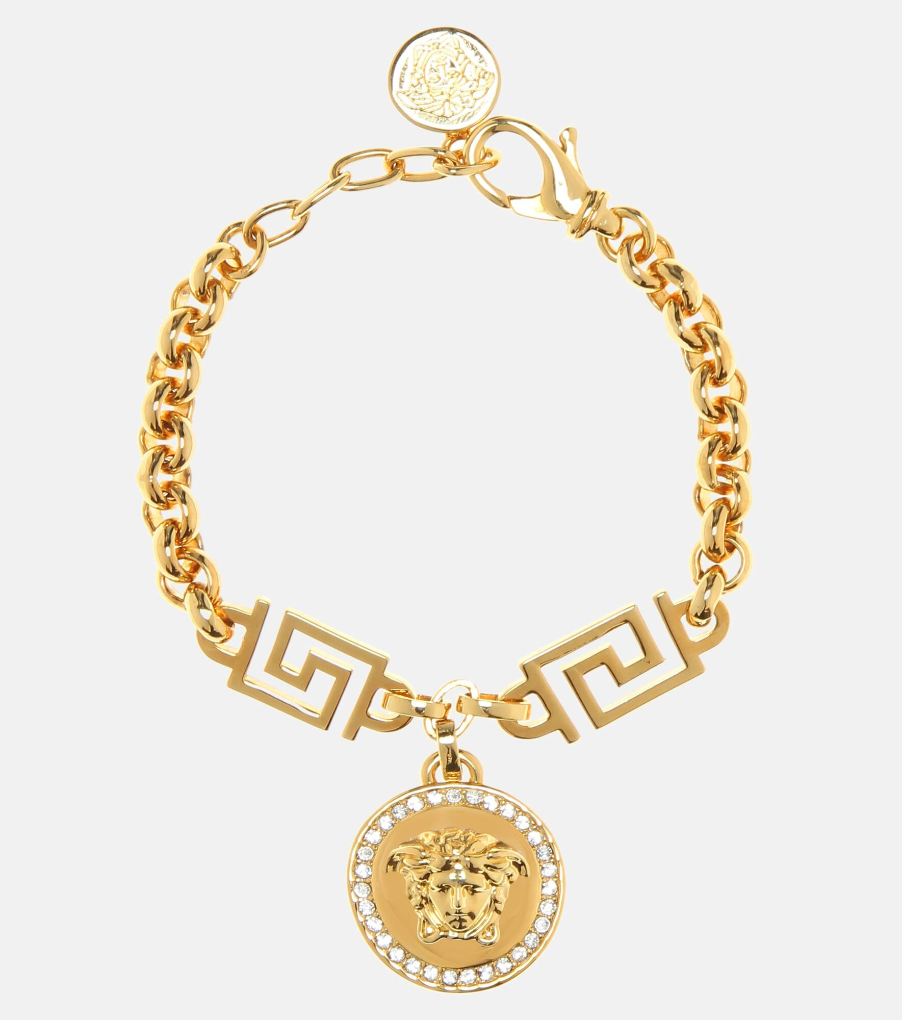 Incorporating the symbols of the iconic fashion house, Versace's bracelet exudes an opulent glamour for which the label is known. Crafted in Italy from golden metal, the piece features a chain strap with links in the shape of the Greek Key. However, the focal point is the Medusa head medallion, which is trimmed with sparkling crystals. Product Details - Handmade in Italy - Hypoallergenic - Closure: lobster-clasp fastening - Material: brass - Item number: P00300261 Size & Fit - Adjustable length - Length when open 20cm-8" - Max. width 1cm-0.5" - Pendant length 3,7cm-1.5" - Pendant width 2,4cm-1"