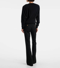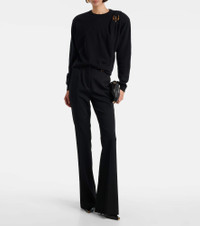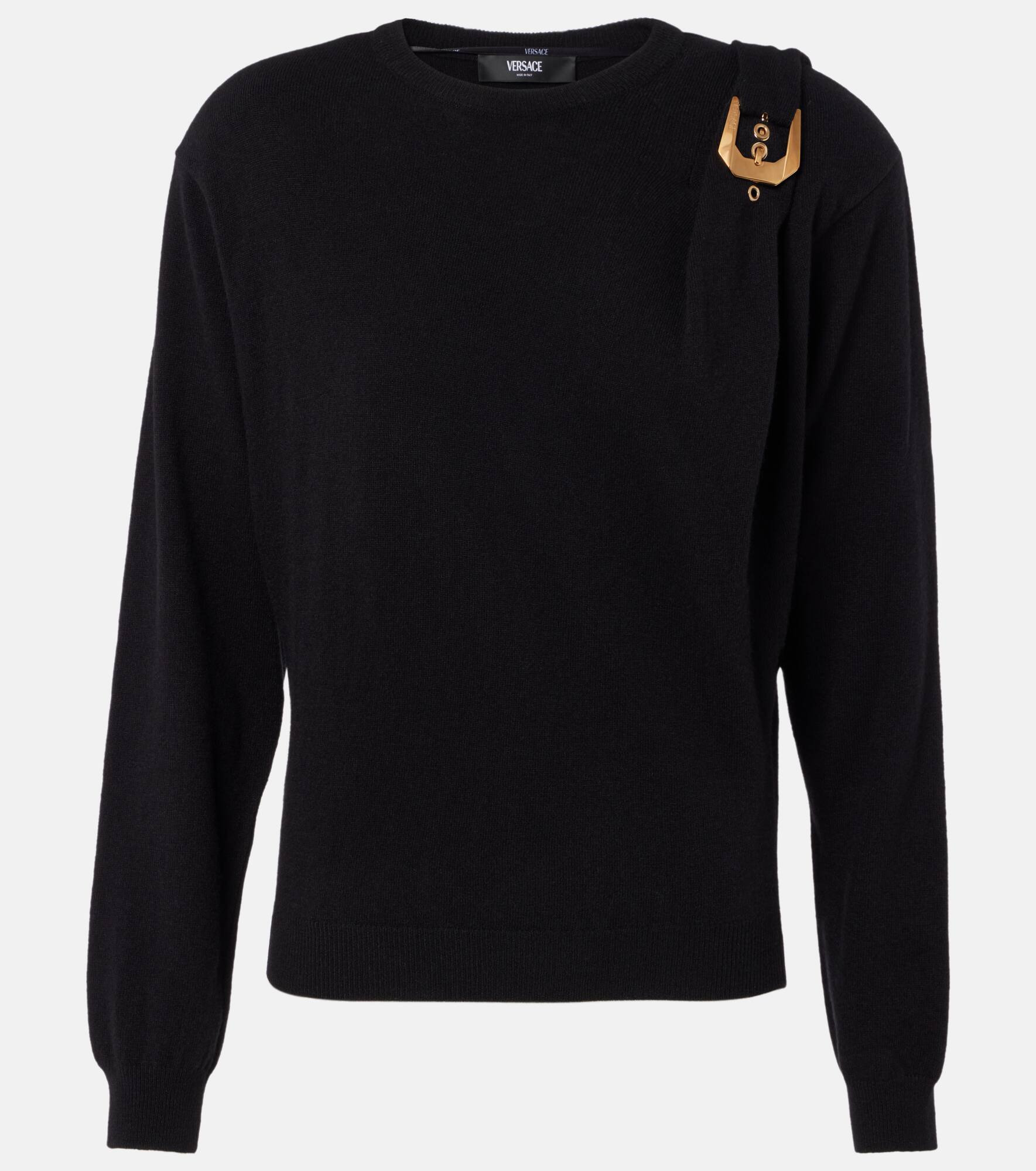 This Versace sweater is made in Italy from pure virgin wool. The piece comes with padded shoulders, draped detailing, and a Medusa Heritage buckle accentuating one shoulder with golden hardware. Product Details - Material: 100% virgin wool - Care instructions: dry clean - Made in Italy - Designer color name: Black - Item color: black - Shoulder pads - Collar: crewneck - Hardware color: gold - Hem: ribbed - Cuff: ribbed - Item number: P01080592