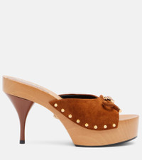 Radiate glamour with every step in the Opera mules from Versace. The pair is designed with classic wooden silhouettes and suede uppers, featuring stiletto heels and bow details adorned with signature Medusa hardware. Product Details - Upper: calf leather (suede) - Lining: leather - Sole: wooden insole, rubber sole - Color: brown - Toe shape: round open toe - Made in Spain - Includes: shoe box - Designer color name: Spice Brown - Versace Gold - Hardware color: gold - Item number: P01131085 Size & Fit - Fits slightly large to size - we recommend trying a half size smaller - European sizes - 9cm-3.5" heel - 3cm-1" platform