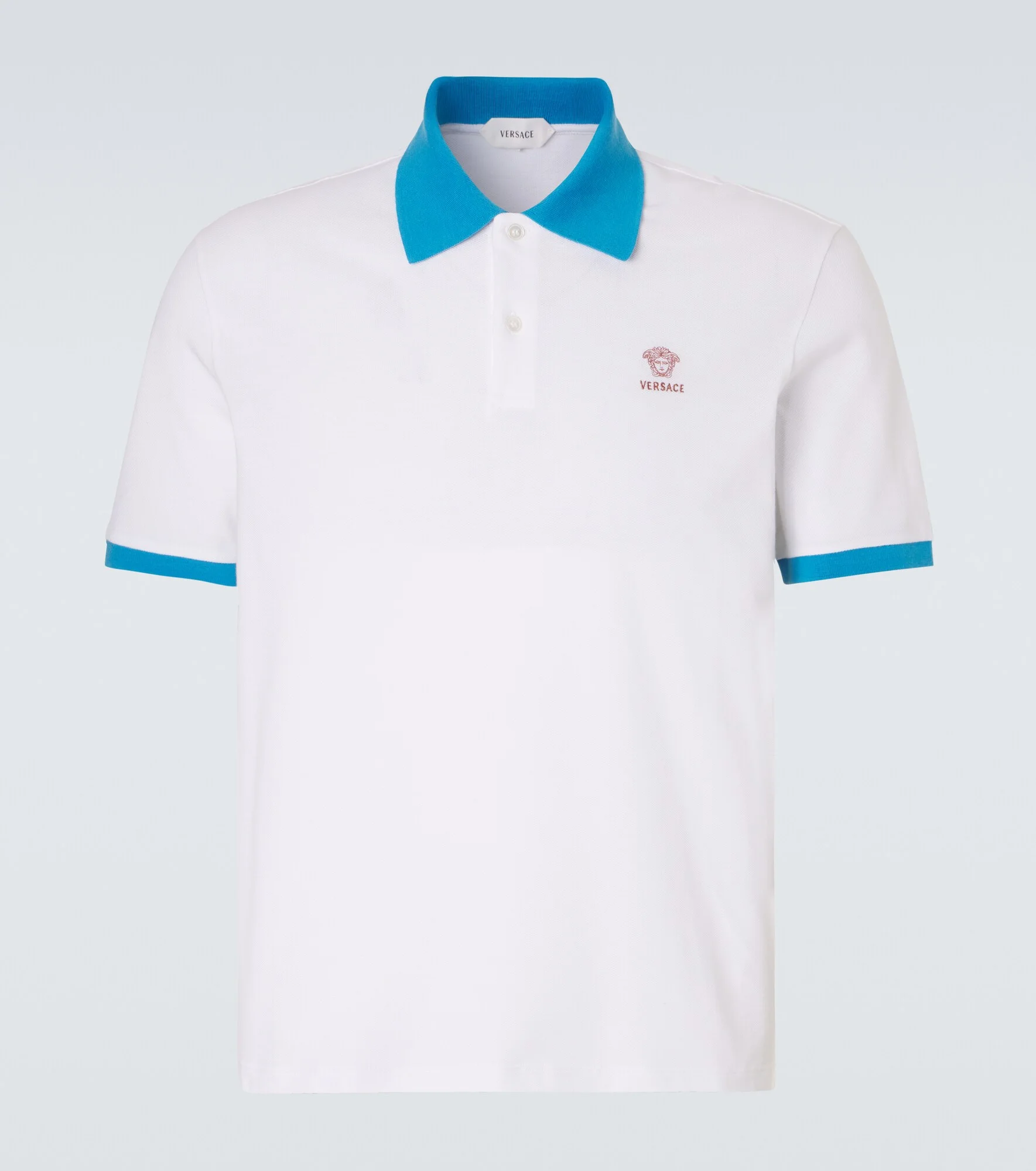 Versace brings fearless glamour to the forefront through powerful silhouettes and iconic design. This polo shirt is crafted from cotton pique and features an embroidered logo and bright, contrasting trims. Product Details - Material: 100% cotton - Care instructions: hand wash - Made in Italy - Color: white - Designer color name: White+Azure Blue - Embroidery: 100% polyester - Trim: 100% cotton - Collar: polo collar - Closure: partially buttoned front - Cuff: ribbed - Item number: P01149581 Size & Fit - True to size - Straight fit - Slightly stretchy fabric - Falls to the hip - Height of model is 189cm-74.5" and wears a size L