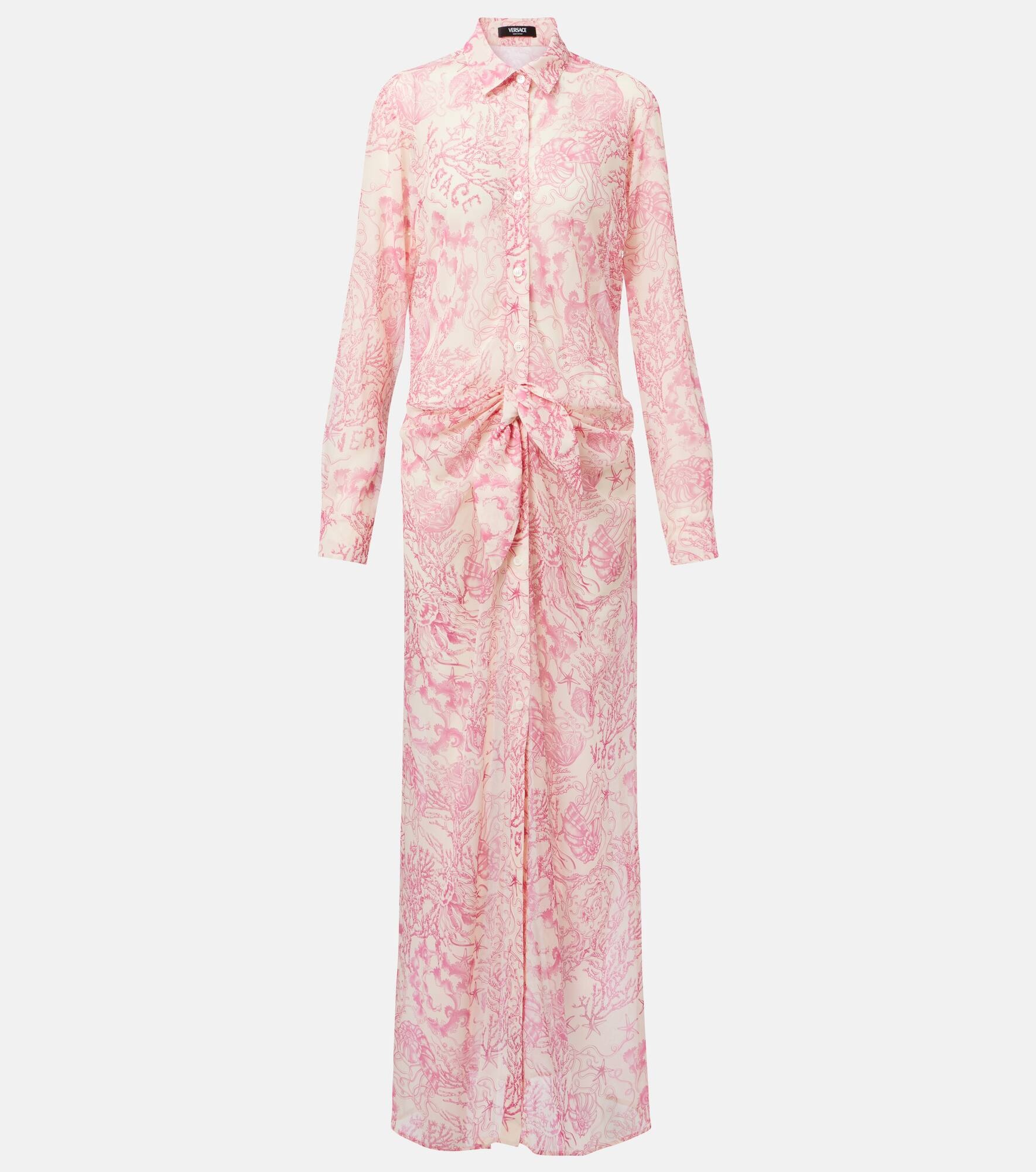 Versace's Baroque-inspired prints recall the intricate ornamentation of the 17th century. This shirt dress features an ornate print and is complete with a gathered front detail. Product Details - Material: 100% polyester - Care instructions: dry clean - Made in Italy - Designer color name: Eggshell+Dragonfruit - Item color: pink - Item number: P01069642 Size & Fit - True to size - For a closer fit, we recommend taking one size down - Dropped shoulders - Sheer - Designed for a loose fit - Non-stretchy fabric - The model seen in the picture is 178cm-5'10" and wearing a size IT 40