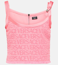 Part of the La Vacanza collection, this pink cotton terry top features all-over flocked Versace lettering. Trimmed with grosgrain piping and rear zip, this style is punctuated by silver-tone Safety Pin hardware. Product Details - Material: 100% cotton - Care instructions: dry clean - Made in Italy - Designer color name: Flamingo - Trim: 100% silk - Lining: 75% acetate, 25% silk - Closure: zipped back - Item number: P00841573 Size & Fit - Fits large to size - we recommend trying one size smaller - Fitted - Mid-weight material - Cropped - The model seen in the picture is 178cm-5'10" and wearing a size IT 40