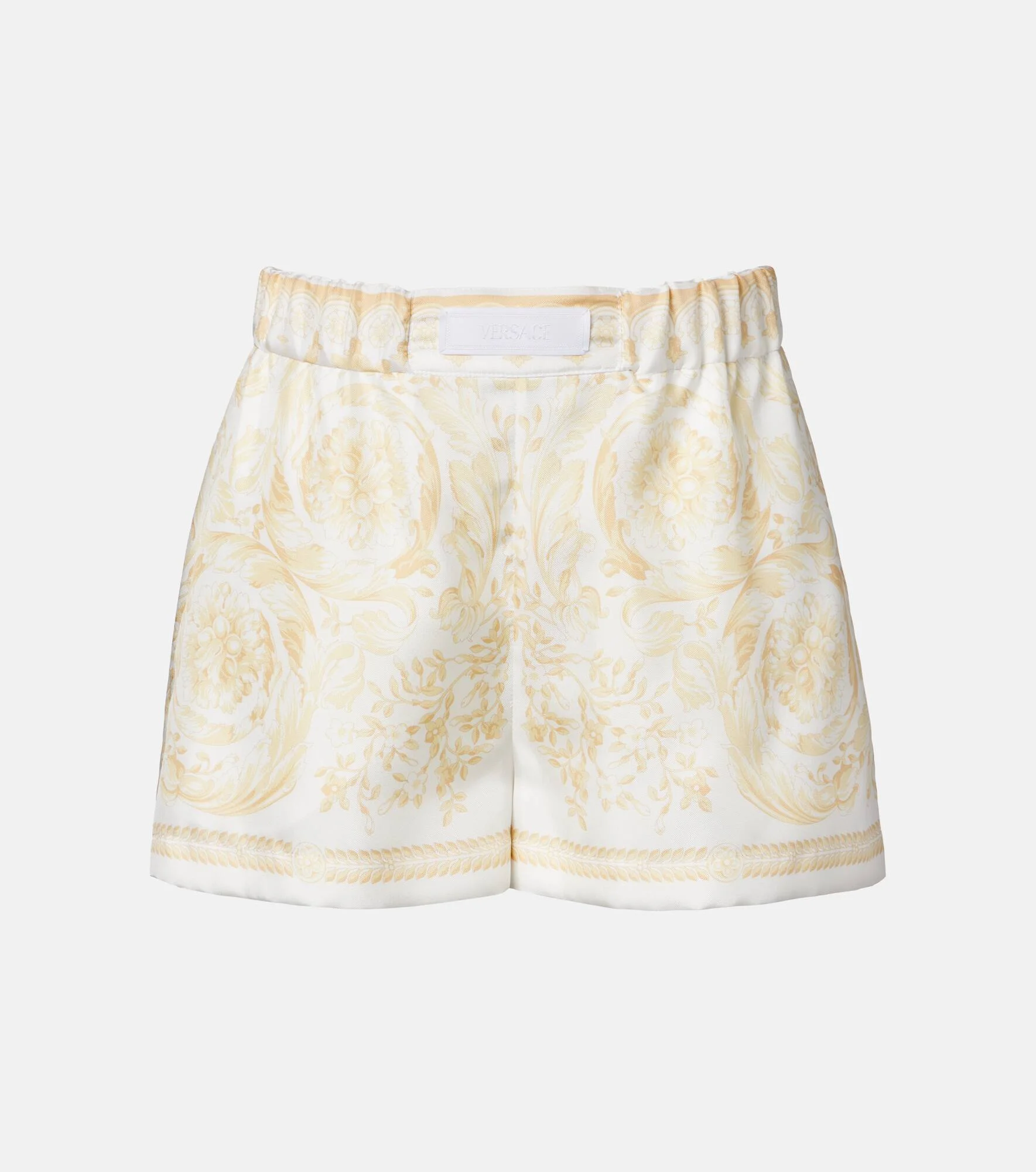 Made from luminous silk twill with an all-over Underwater Barocco print, these shorts come with an elasticated waistband. Versace's Baroque-inspired prints recall the intricate ornamentation of the 17th century. Product Details - Material: 100% silk - Care instructions: dry clean - Made in Italy - Designer color name: Washed Out Gold - Item color: gold - Lining: 75% acetate, 25% silk - Elasticated waistband - Pockets: side slit pockets - Item number: P01129238 Size & Fit - True to size - Elasticated waist - Non-stretchy fabric - Wide-leg - High-waisted - Height of model is 175cm-69" and wears a size IT 40