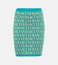 Featuring the Versace Allover pattern, this miniskirt from Versace is instantly recognizable. Knitted from a cotton blend into a pencil silhouette, it features the brand's lettering through an allover pattern. Product Details - Made in Italy - Material: 40% viscose, 1% elastane, 2% polyamide, 57% cotton - Care instructions: machine wash at 30 degrees - Designer color name: Turquoise+Light Blue - Item number: P00837108 Size & Fit - True to size - Fitted - Mid-weight material - The model seen in the picture is 178cm-5'10" and wearing a size IT 40