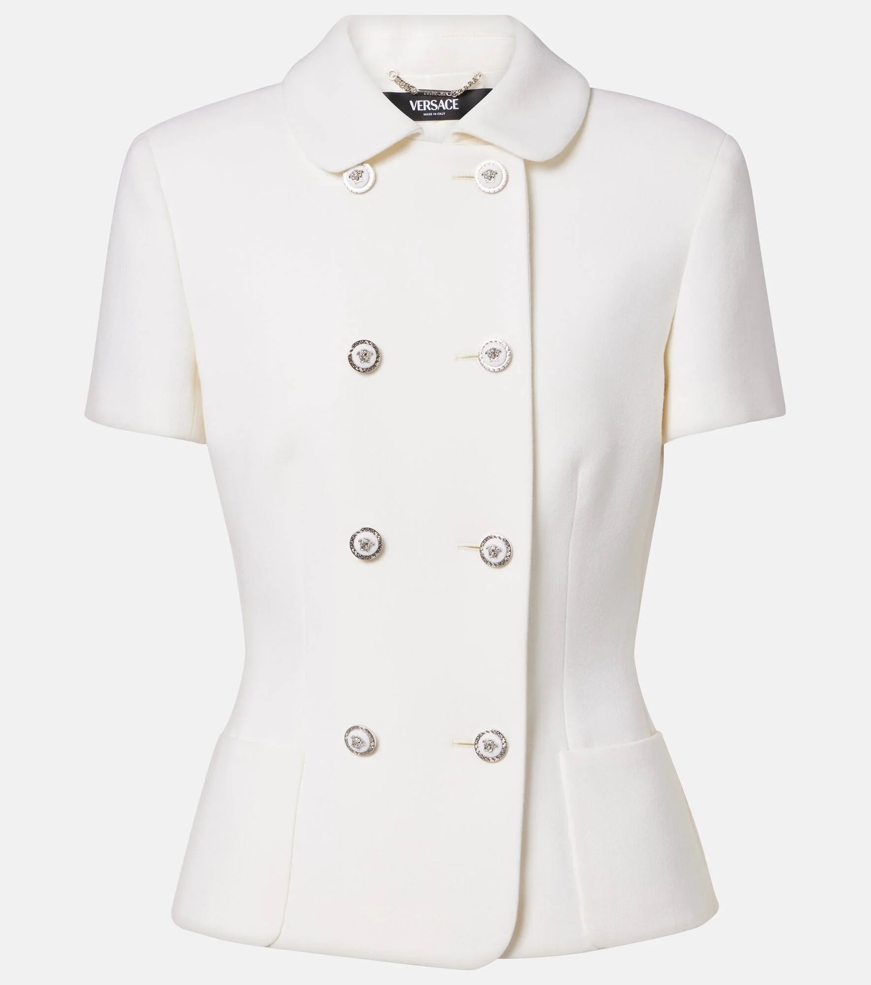 Embrace timeless glamour with this design from Versace. This blazer is crafted from virgin wool and features a double-breasted silhouette with patch pockets. Product Details - Material: 100% virgin wool - Care instructions: dry clean - Made in Italy - Designer color name: White - Item color: white - Lining: 100% cupro - Closure: double-breasted - Pockets: patch pockets - Item number: P01129280 Size & Fit - Fits large to size - we recommend trying one size smaller - Shoulder pad inserts - Cinched waist - Non-stretchy fabric - Falls to the hip - Height of model is 178cm-70" and wears a size IT 38