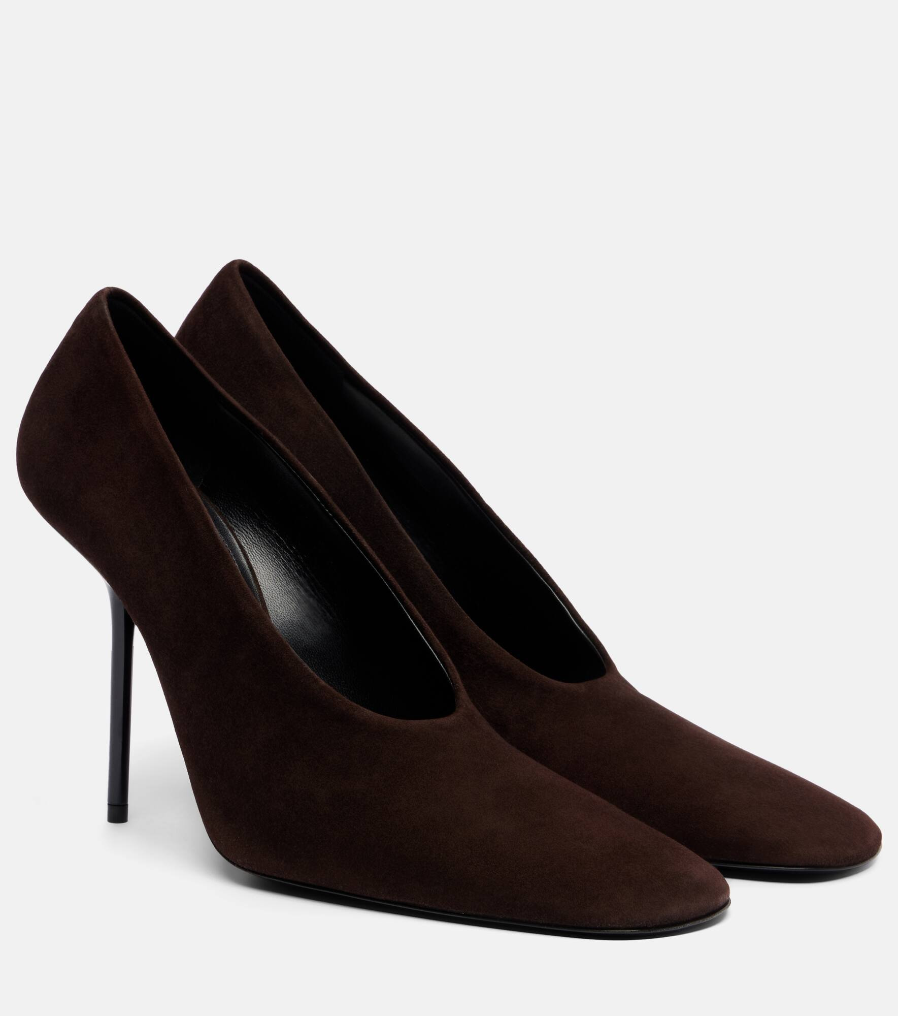 Victoria Beckham's eponymous label offers chic and understated designs that create a versatile wardrobe. Standing on 100mm stiletto heels, these pumps are crafted in Italy from buttery-soft suede and feature square toes. Product Details - Upper: goat leather (suede) - Lining: leather - Sole: leather insole and sole - Toe shape: square toe - Made in Italy - Includes: shoe box, dust bag - Designer color name: Chocolate - Item color: brown - Item number: P01101034 Size & Fit - True to size - Half sizes please take the next size down - European sizes - 10cm-4" heel (size EU 38)