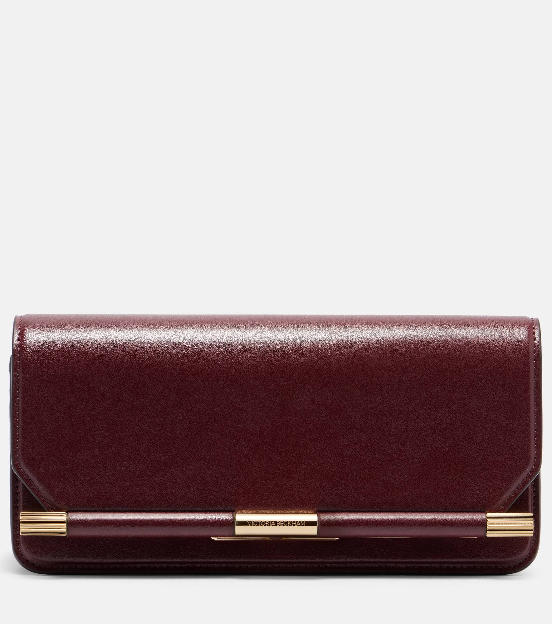Inspired by classic menswear accessories, the 202 clutch from Victoria Beckham features a distinctive front cufflink detail. This Mini iteration is crafted in Italy from burgundy leather and shaped into a sleek, rectangular silhouette. Product Details - Material: leather - Lining: leather - Made in Italy - Designer color name: Burgundy - Item color: burgundy - Hardware color: gold - Closure: magnetic fastening - Internal details: card slot - Includes: dust bag - Item number: P01042207 Size & Fit - Height 11cm-4.5" - Width 23cm-9" - Depth 6,5cm-2.5"
