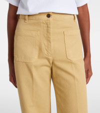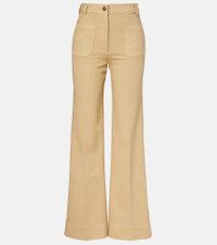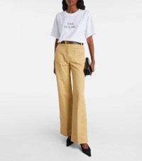 Victoria Beckham's eponymous label centers around chic, understated styles. The Alina jeans are made from pure cotton denim and have a high-rise silhouette with subtly flared legs. Product Details - Material: 100% cotton - Care instructions: machine wash at 30 degrees - Made in Italy - Designer color name: Butter Yellow Garment Dye - Item color: beige - Details: 100% leather - Contains non-textile parts of animal origin - Closure: zipper fly, button fastening - Pockets: patch pockets, back pockets - Belt loops - Item number: P01091625 Size & Fit - Fits small to size - we recommend trying one size larger - Non-stretchy fabric - Wide-leg - High-rise - The model seen in the picture is 178cm-5'10" and wearing a size 27