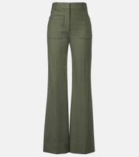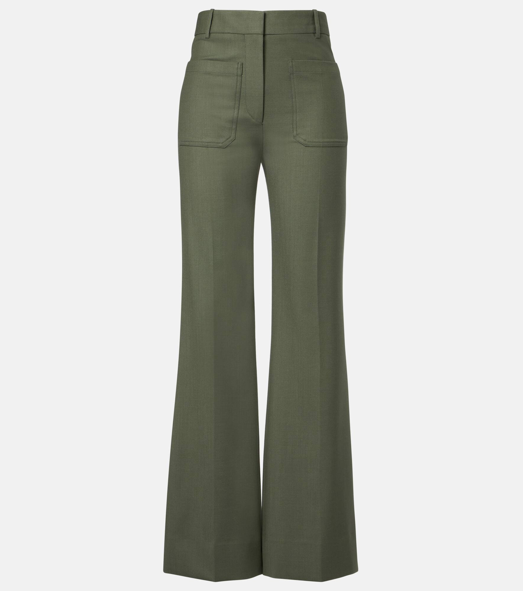 Victoria Beckham's eponymous label centers around chic, understated styles. The Alina jeans have a high-rise silhouette with subtly flared legs and feature belt loops, patch pockets, and back pockets for easy storage. Product Details - Material: 53% polyester, 43% wool, 4% elastane - Care instructions: dry clean - Made in Portugal - Designer color name: Oregano - Item color: green - Closure: zipper, hook fastening - Belt loops - Pockets: patch pockets, back pockets - Single pleat - Item number: P01091730 Size & Fit - True to size - Non-stretchy fabric - Flared - High-waisted - The model seen in the picture is 178cm-5'10" and wearing a size UK 8
