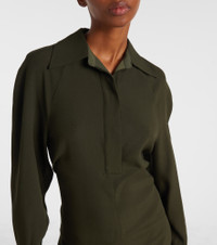 Victoria Beckham’s eponymous label is known for its chic, understated aesthetic. This collared midi dress features structured back pleats that extend into an elongated hem. Product Details - Material: 71% acetate, 29% viscose - Care instructions: dry clean - Made in Lithuania - Designer color name: Dark Olive - Item color: green - Material II: 100% polyester - Cuff: buttoned - Closure: partially buttoned front, concealed zipper, zipped back - Item number: P01091675 Size & Fit - Fits small to size - we recommend trying one size larger - Cinched waist - Non-stretchy fabric - The model seen in the picture is 178cm-5'10" and wearing a size UK 10