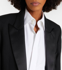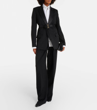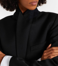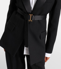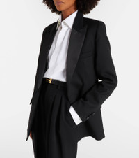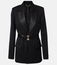 Victoria Beckham's eponymous label centers around chic, understated styles. Made from grain de poudre, this elegant blazer features satin lapels and a detachable belt for a cinched silhouette. Product Details - Material: 55% polyester, 45% wool - Care instructions: dry clean - Made in Portugal - Designer color name: Black - Item color: black - Material II: 100% polyester - Lining: 100% viscose - Pocket lining: 70% cotton, 30% polyamide - Closure: concealed buttoned front - Pockets: flap pockets, internal pocket, angled chest pocket - Detachable belt - Vent: double - Cuff: buttoned - Item number: P01122495 Size & Fit - True to size - Shoulder pad inserts - Loose fit, comes with belt - Non-stretchy fabric - slit length 25cm-10" - The model seen in the picture is 178cm-5'10" and wearing a size UK 8