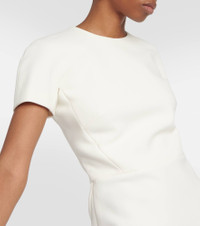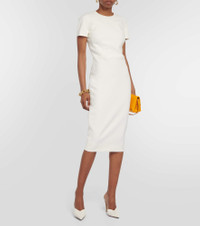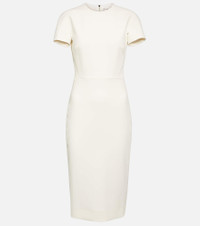 This midi dress from Victoria Beckham has a round neckline, short sleeves, and crêpe construction. The fitted design has a full-length silver-tone zipper in the back for a contemporary touch. Product Details - Lining: 100% polyester, partially lined - Closure: two-way zipped back - Care instructions: dry clean - Designer color name: Ivory - Material: 16% polyamide, 3% elastane, 36% wool, 45% polyester - Made in Portugal - Item number: P00829765 Size & Fit - True to size - Fitted - Mid-weight material - The model seen in the picture is 178cm-5'10" and wearing a size UK 8