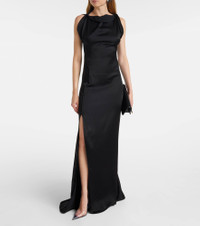 Victoria Beckham's eponymous label centers around chic, understated styles. This gown is made in Italy and has a high neckline that highlights the fluid drape of the crepe satin fabrication. Product Details - Material: 71% acetate, 29% viscose - Care instructions: dry clean - Made in Italy - Designer color name: Black - Item color: black - Closure: invisible zipper - Item number: P01091718 Size & Fit - True to size - Cinched waist - Non-stretchy fabric - The model seen in the picture is 178cm-5'10" and wearing a size UK 8