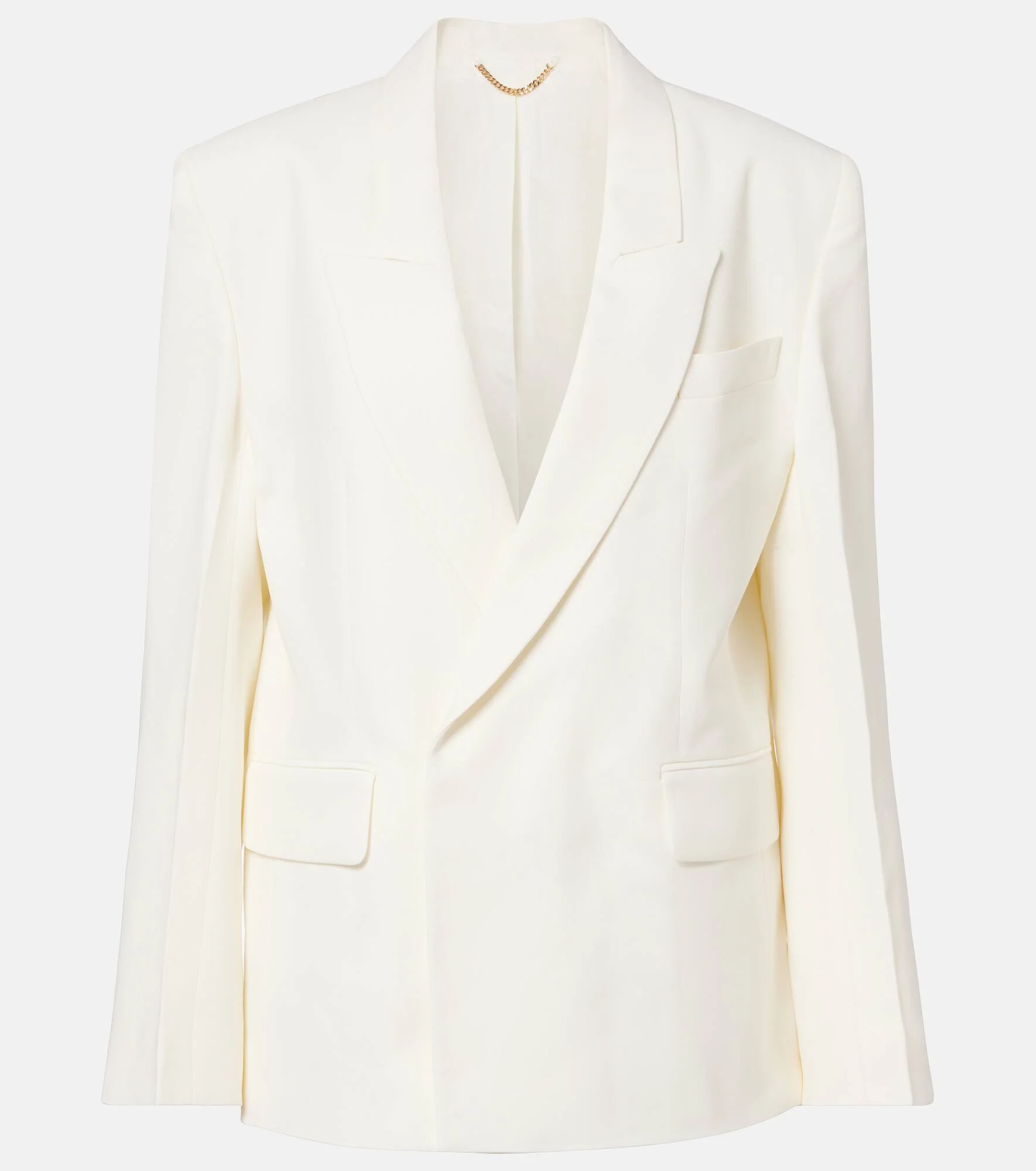Victoria Beckham's eponymous label centers around chic, understated styles. This blazer has a sleek, single-breasted silhouette with sharp peak lapels and roomy patch pockets on the sides. Product Details - Material: 100% viscose - Care instructions: dry clean - Made in Portugal - Color: white - Designer color name: Ivory - Item color: white - Lining: 100% polyester (recycled) - Pocket lining: 70% cotton, 30% polyamide - Peak lapel - Closure: double-breasted - Pockets: flap pockets, angled chest pocket, internal pocket - Vent: double - Item number: P01122436 Size & Fit - True to size - Shoulder pad inserts - Oversized - Non-stretchy fabric - Falls below the hip - The model seen in the picture is 178cm-5'10" and wearing a size UK 8