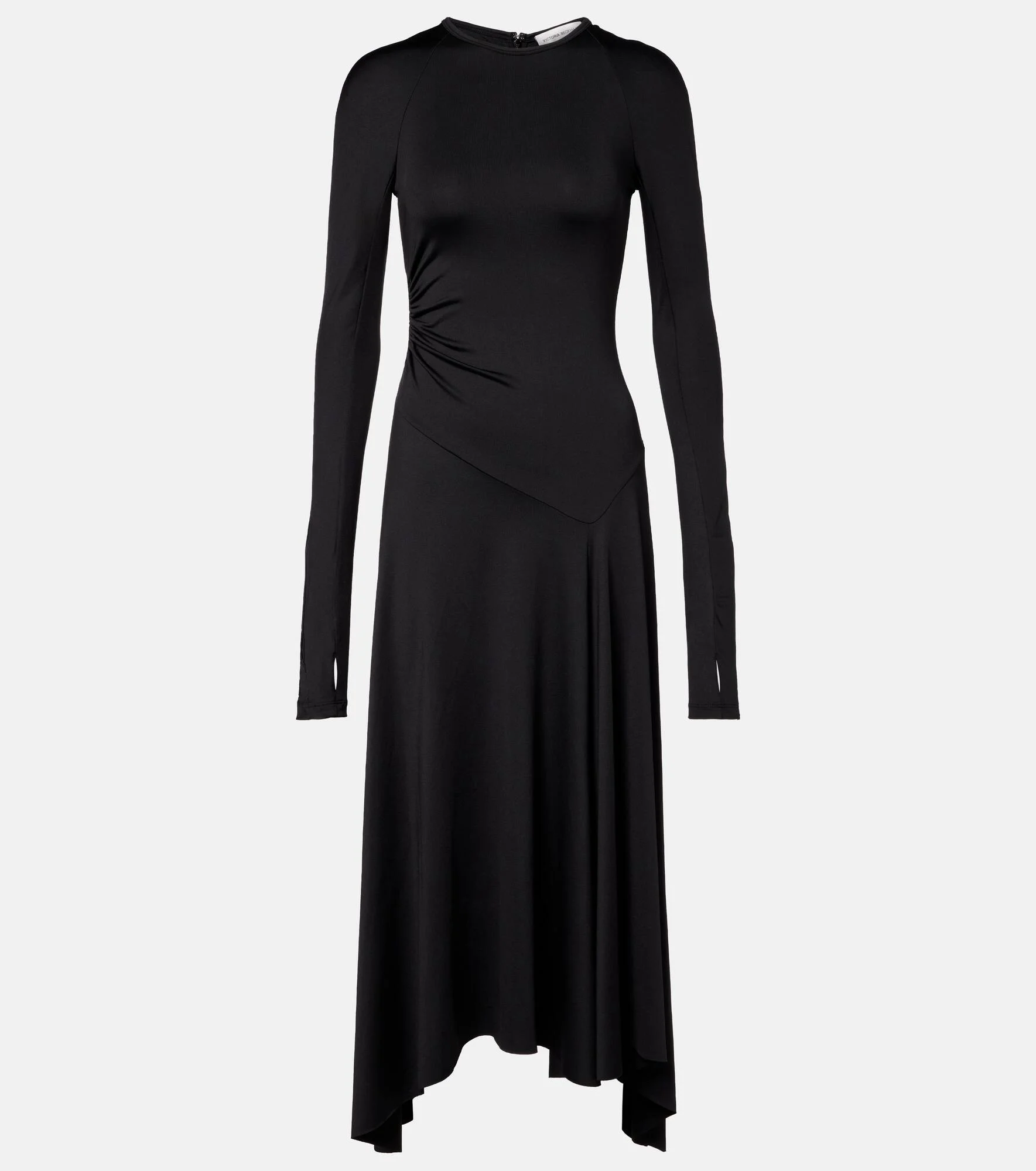 Victoria Beckham's eponymous label centers around chic, understated styles. Featuring an asymmetric hemline, this midi dress features long sleeves with thumb holes and is complete with elegant gathered detailing on the side. Product Details - Material: 90% polyester, 10% elastane - Care instructions: dry clean - Made in Portugal - Designer color name: Black - Item color: black - Closure: concealed zipped back - Sleeve thumb holes - Short vent - Item number: P01122490 Size & Fit - True to size - Cinched waist - Slightly stretchy fabric - The model seen in the picture is 178cm-5'10" and wearing a size UK 8