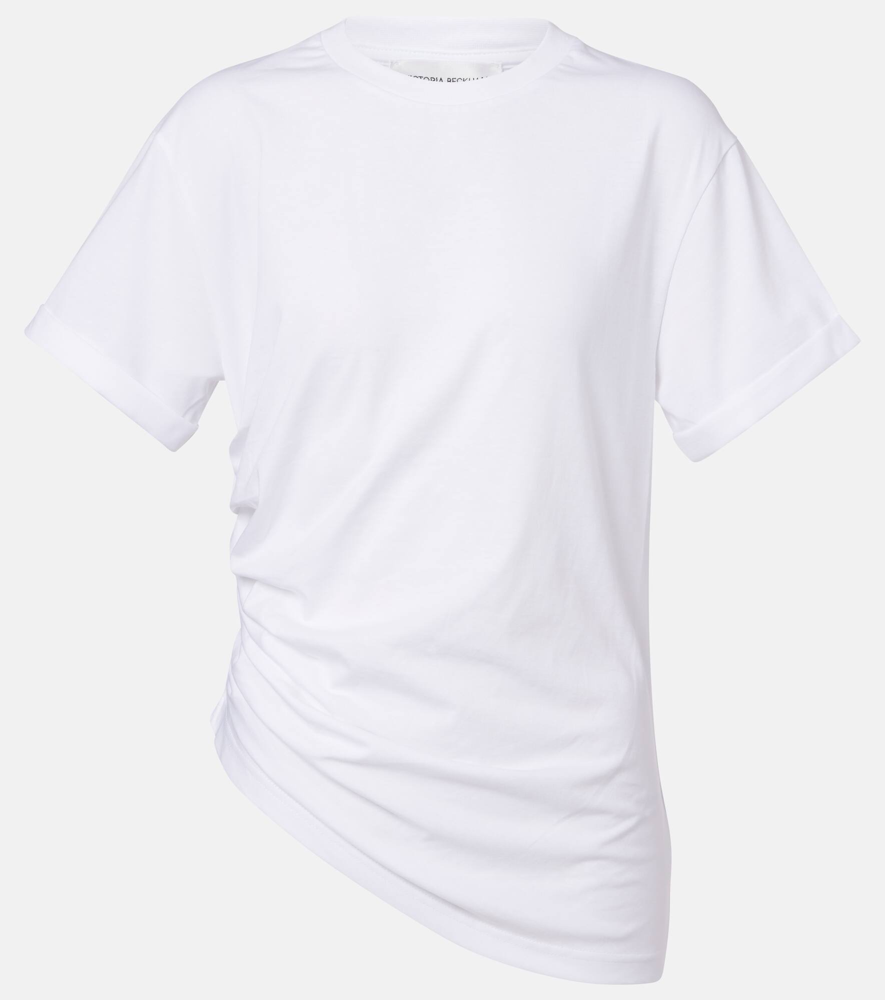 Victoria Beckham's eponymous label centers around chicly understated styles to create a versatile wardrobe. This cotton T-shirt is made from lightweight jersey and features gathered detailing at the side for a cinched effect. Product Details - Material: 100% cotton (organic) - Care instructions: machine wash at 30 degrees - Made in Portugal - Designer color name: White - Item color: white - Trim: 95% cotton (organic), 5% elastane - Hem: uneven - Item number: P01053823 Size & Fit - True to size - Cinched waist - Non-stretchy fabric - Falls to the hip - The model seen in the picture is 178cm-5'10" and wearing a size XS