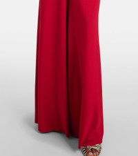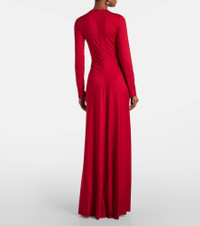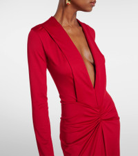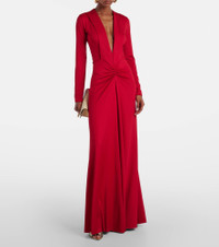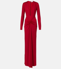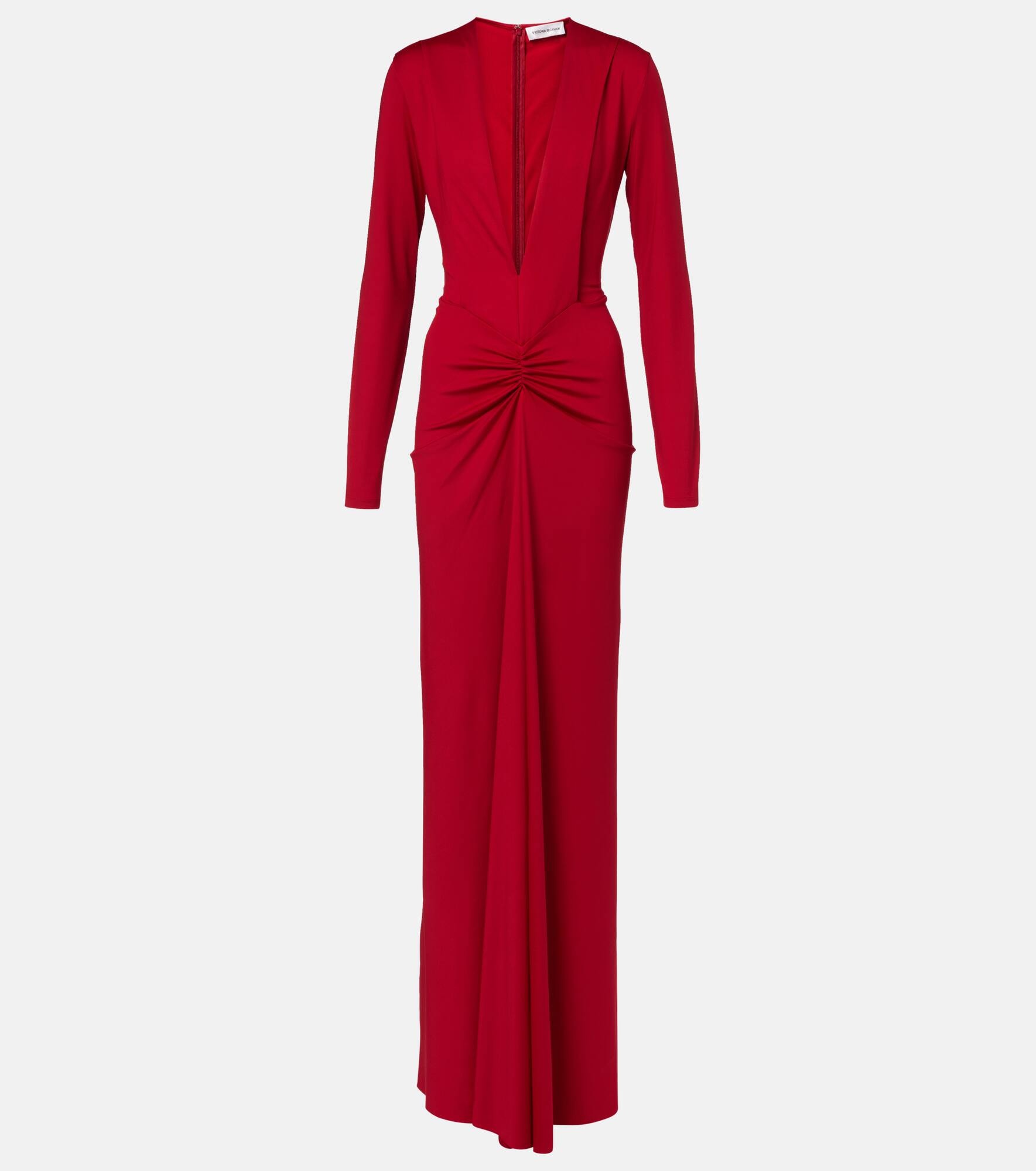 Victoria Beckham's eponymous label centers around chic, confidence-enhancing styles, like this gown. Defined by a plunging V-neckline and gathered detailing at the center, this long-sleeved silhouette exudes a sense of timeless elegance. Product Details - Material: 90% polyester, 10% elastane - Care instructions: dry clean - Made in Portugal - Designer color name: Rose - Item color: red - Collar: V-neck - Closure: zipped back - Item number: P01053812 Size & Fit - True to size - Dropped shoulders - Cinched waist - Stretchy fabric - The model seen in the picture is 178cm-5'10" and wearing a size UK 8