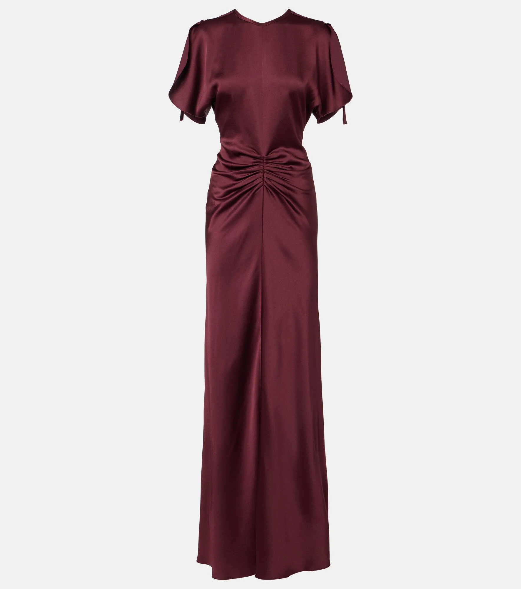 Victoria Beckham's eponymous label centers around chic, understated styles like this maxi dress. A classic short-sleeved style, the jersey silhouette is accented by a flattering gathered detail at the front. Product Details - Material: 71% acetate, 29% viscose - Care instructions: dry clean - Made in Portugal - Designer color name: Cinnabar Red - Item color: burgundy - Closure: concealed zipped back - Item number: P01122446 Size & Fit - True to size - Cinched waist - Non-stretchy fabric - The model seen in the picture is 178cm-5'10" and wearing a size UK 8