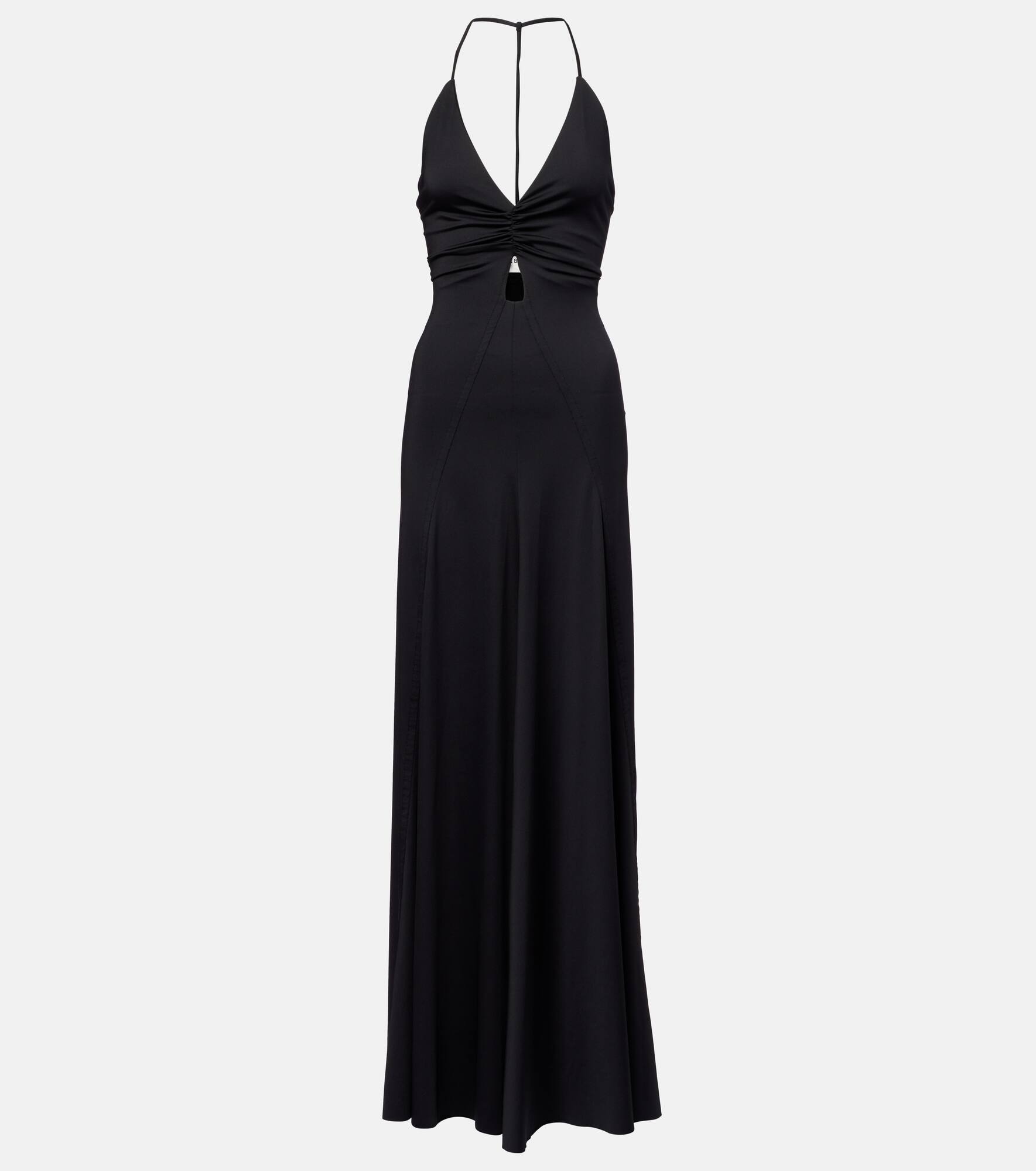 Victoria Beckham's eponymous label centers around chicly understated styles to create a versatile wardrobe. Made in Portugal from jersey, this gown gathers below the neckline for a fitted effect and features an open back. Product Details - Material: 90% polyester, 10% elastane - Care instructions: dry clean - Made in Portugal - Designer color name: Black - Item color: black - Item number: P01038184 Size & Fit - True to size - Low back - Cinched waist - Stretchy fabric - The model seen in the picture is 178cm-5'10" and wearing a size UK 8