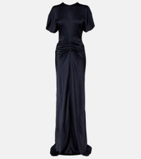 Timeless and sophisticated, this gown from Victoria Beckham is primed for special events and more. Made from lustrous satin, the style is complete with elegant gathered detailing at the center. Product Details - Material: 71% acetate, 29% viscose - Care instructions: dry clean - Made in Portugal - Designer color name: Navy - Item color: blue - Closure: concealed zipped back - Item number: P01122449 Size & Fit - True to size - Cinched waist - Non-stretchy fabric - The model seen in the picture is 178cm-5'10" and wearing a size UK 8