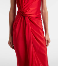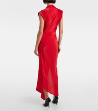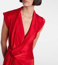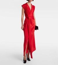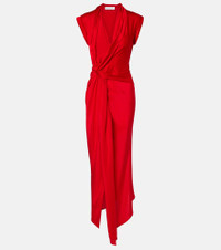 Victoria Beckham's eponymous label centers around chic, understated styles. Designed with a jersey bodice and a silk crepe de chine skirt, this maxi dress features a plunging neckline, a gathered detail to accentuate the natural waistline, and draped design. Product Details - Material: 90% viscose, 10% elastane - Care instructions: dry clean - Made in Portugal - Designer color name: Cardinal Red - Item color: red - Lining: 100% silk - Closure: concealed zipped side - Long vent - Item number: P01122448 Size & Fit - True to size - Cinched waist - Non-stretchy fabric - The model seen in the picture is 178cm-5'10" and wearing a size UK 8