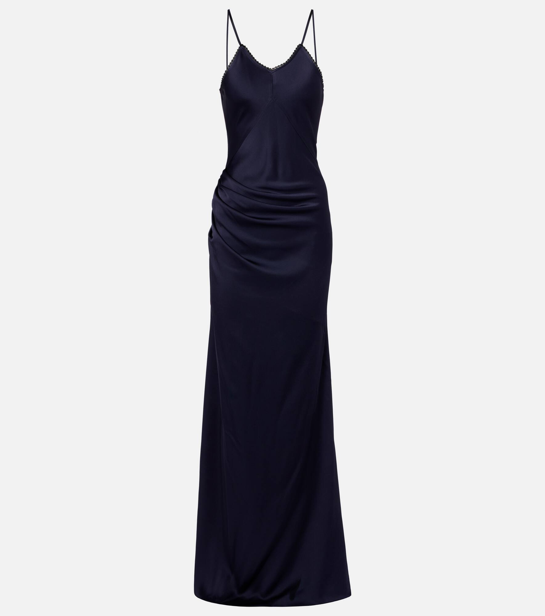 Victoria Beckham’s eponymous label centers around chicly understated styles to create a versatile wardrobe, as seen in this satin maxi dress, detailed with delicate lace trims and slender spaghetti straps for a refined evening silhouette. Product Details - Material: 71% acetate, 29% viscose - Care instructions: dry clean - Made in the UK - Designer color name: Midnight - Item color: blue - Trim: 100% cotton - Item number: P01053766 Size & Fit - True to size - Low back - Cinched waist - Non-stretchy fabric - The model seen in the picture is 178cm-5'10" and wearing a size UK 8