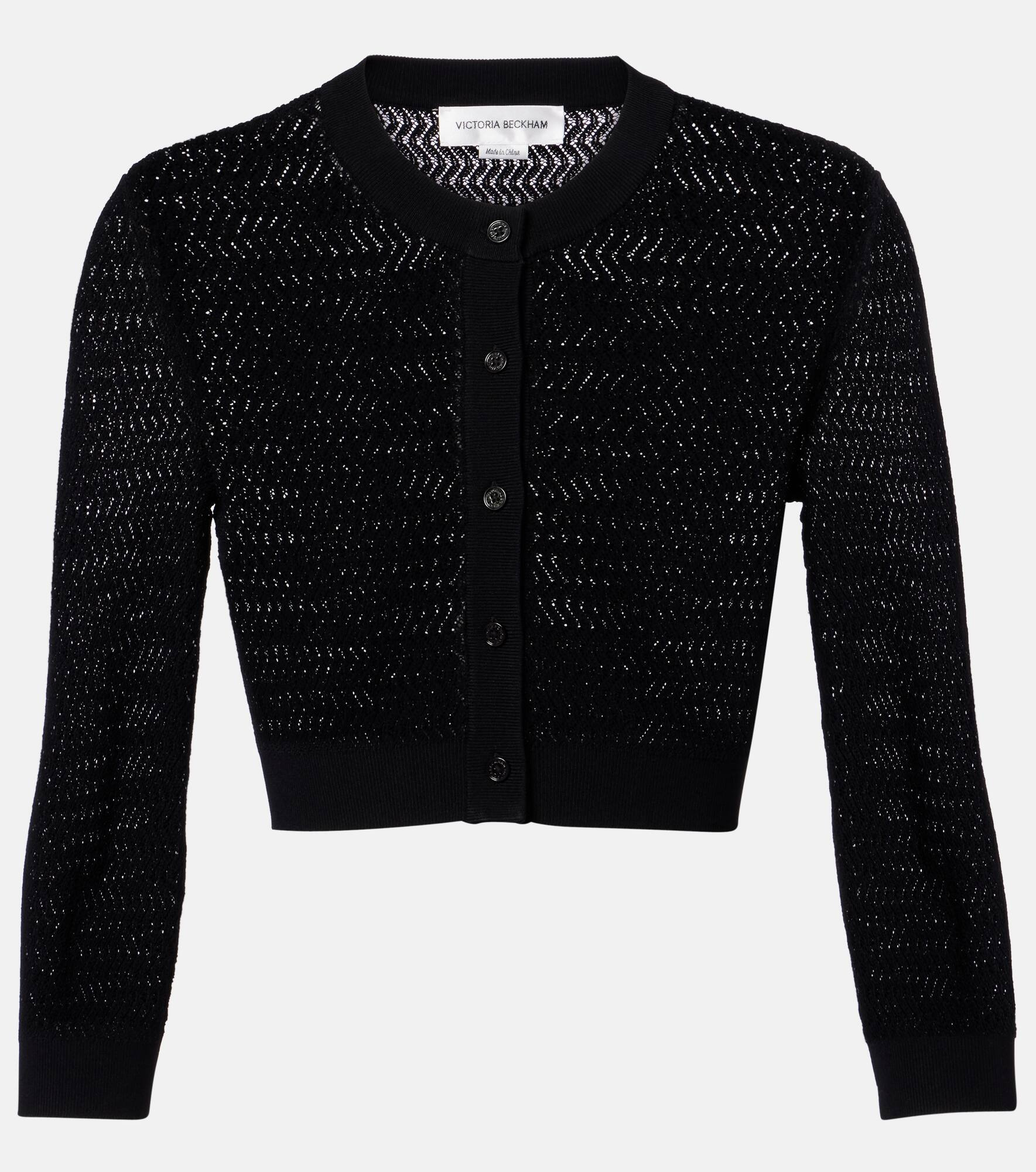 Victoria Beckham's eponymous label centers around chicly understated styles to create a versatile wardrobe. Bring texture to your looks with this pointelle cardigan, coming in a fitted, cropped silhouette. Product Details - Material: 83% viscose, 17% polyamide - Care instructions: dry clean - Made in China - Designer color name: Black - Item color: black - Trim: 80% viscose, 20% polyamide - Item number: P01053830 Size & Fit - True to size - Semi-sheer - Cinched waist - Stretchy fabric - Cropped - The model seen in the picture is 178cm-5'10" and wearing a size XS