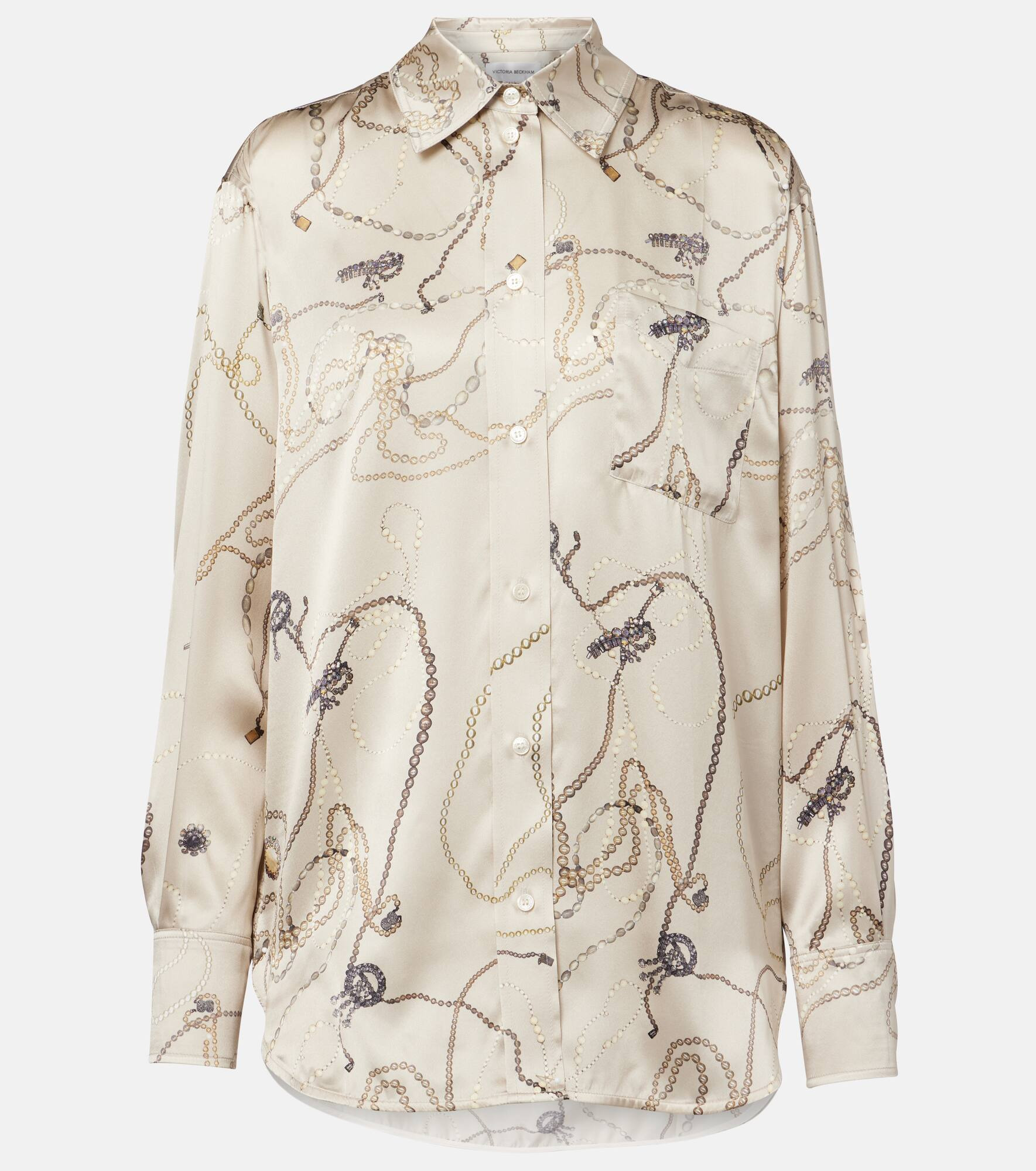 Victoria Beckham's eponymous label centers around chicly understated styles to create a versatile wardrobe. Crafted in silk, this long-sleeved shirt falls to the hip and features a charming all-over print. Product Details - Material: 100% silk - Care instructions: dry clean - Made in Portugal - Designer color name: Pumice - Item color: beige - Item number: P01053935 Size & Fit - True to size - Dropped shoulders - Designed for a loose fit - Non-stretchy fabric - Falls below the hip - The model seen in the picture is 178cm-5'10" and wearing a size UK 8