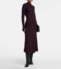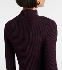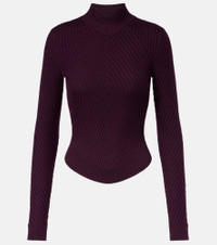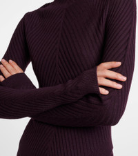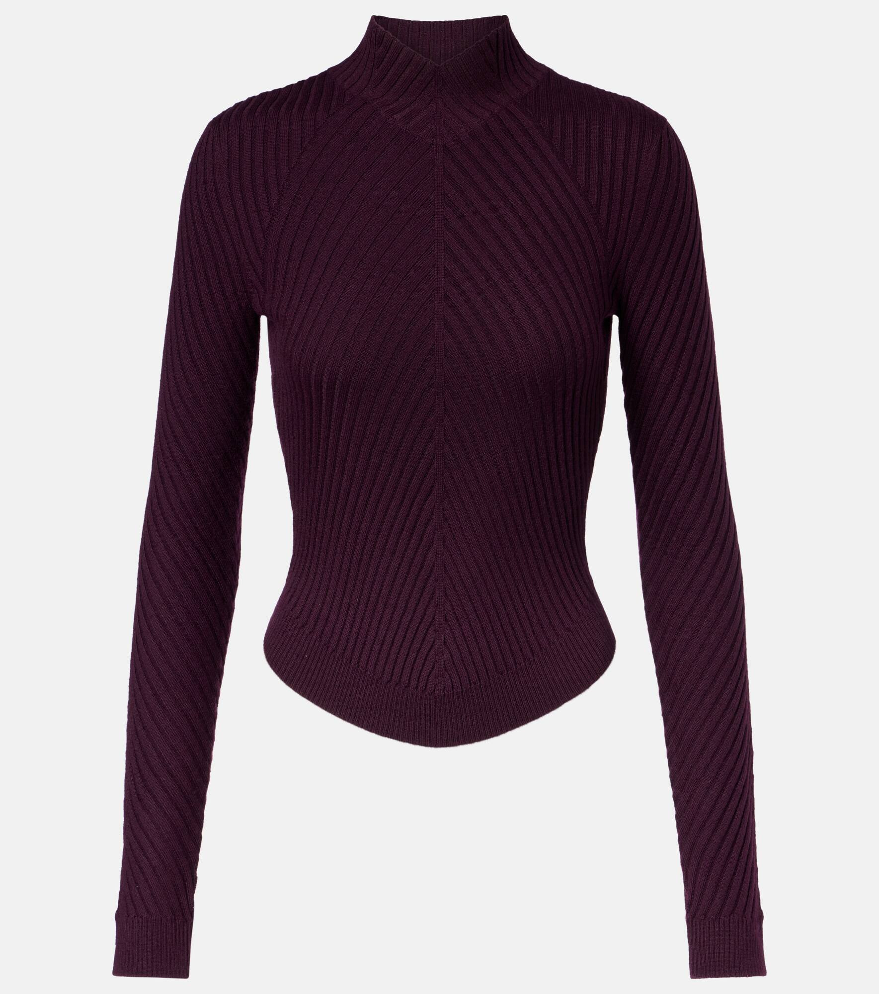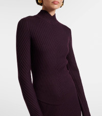 Victoria Beckham's eponymous label centers around chic, understated styles. This turtleneck top has a fitted silhouette and features ribbed-knit herringbone patterning. Product Details - Material: 100% wool (merino wool) - Care instructions: dry clean - Made in China - Designer color name: Merlot - Item color: purple - Collar: turtleneck - Cuff: ribbed - Hem: ribbed - Item number: P01091667 Size & Fit - True to size - Fitted - Stretchy fabric - Falls to the hip - The model seen in the picture is 178cm-5'10" and wearing a size XS