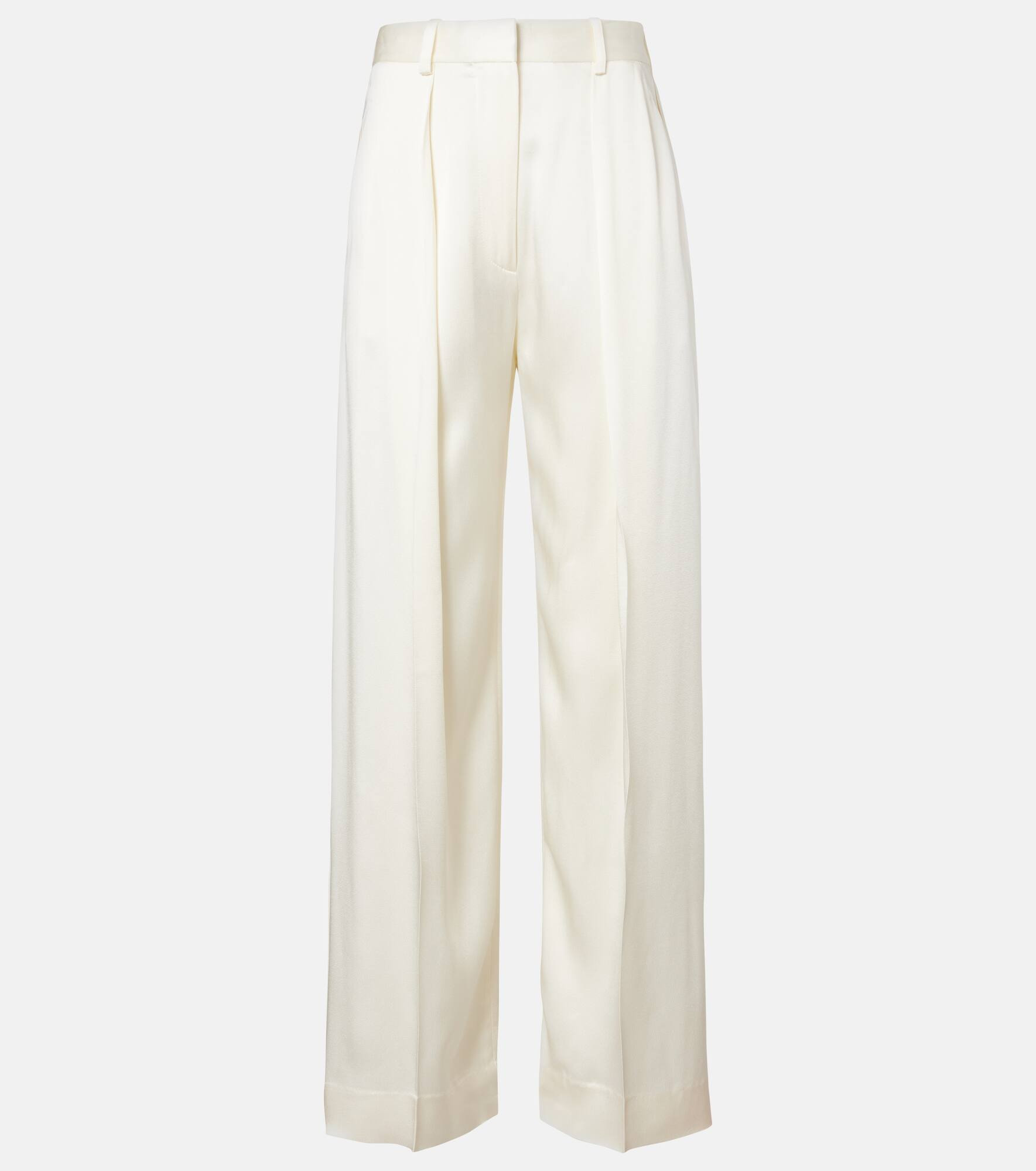 Victoria Beckham's eponymous label centers around chicly understated styles to create a versatile wardrobe. Made from luminous satin, these elegant pants feature a wide-leg silhouette with crisp front pleats and tall cuffs. Product Details - Material: 71% acetate, 29% viscose - Care instructions: dry clean - Made in Portugal - Designer color name: Ivory - Item color: white - Lining: 100% polyester - Closure: zip, hook, and button fastening - Belt loops - Pockets: slant pockets, back pockets - Single pleat - Item number: P01091733 Size & Fit - True to size - Non-stretchy fabric - Wide-leg - High-waisted - The model seen in the picture is 178cm-5'10" and wearing a size UK 8