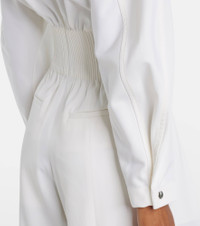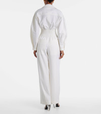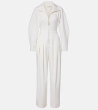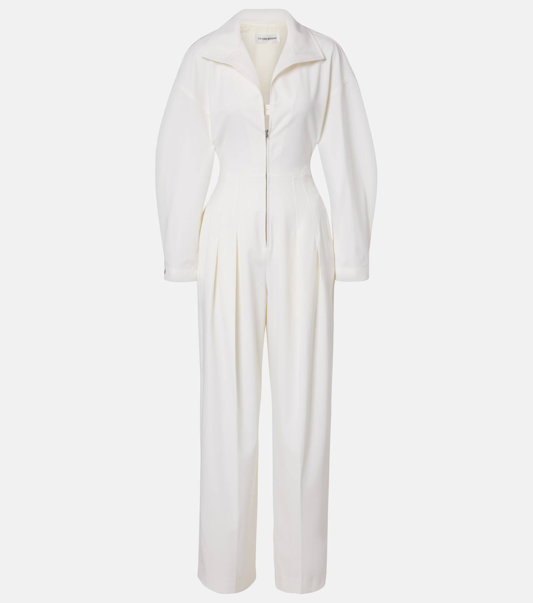The Tab Detail jumpsuit from Victoria Beckham takes its name from its hardware, referencing the design's front zip closure and utilitarian-inspired silhouette. Crafted from a wool blend, the piece features a cinched waist and pleated wide legs. Product Details - Material: 50% wool, 50% polyester - Care instructions: dry clean - Made in Portugal - Designer color name: Ivory - Item color: white - Lining: 52% viscose, 48% cotton - Closure: partially zipped front, concealed buttoned front - Pockets: side slit pockets, back pockets - Elasticated waistband - Cuff: one button - Hem: finished - Item number: P01053923 Size & Fit - True to size - Dropped shoulders - Loose fit, elasticated waist - Non-stretchy fabric - Wide-leg - The model seen in the picture is 178cm-5'10" and wearing a size UK 8