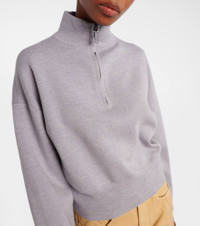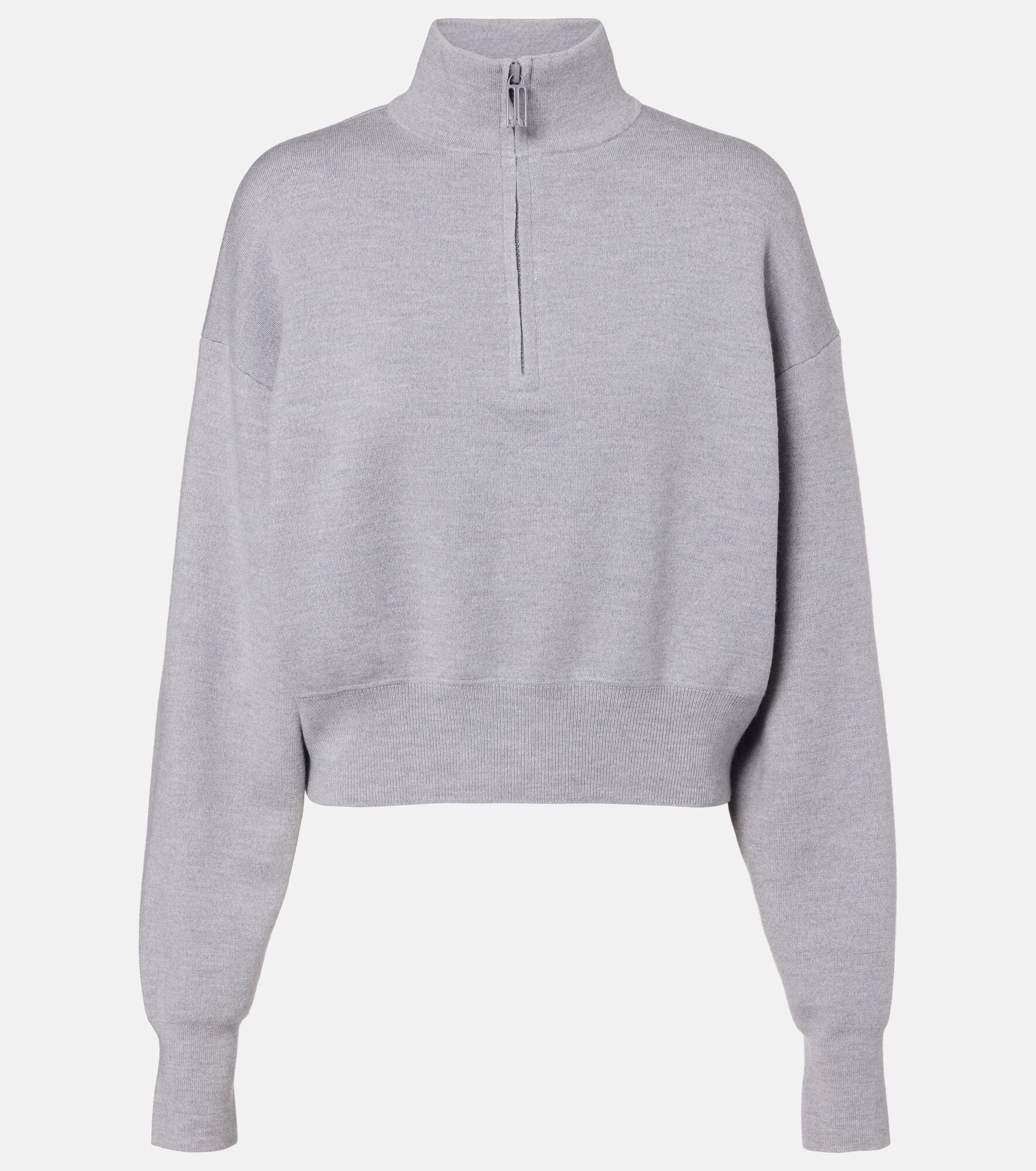 Victoria Beckham's eponymous label centers around chic, understated styles. This half-zip sweater is made from a wool blend and features ribbed-knit trims around the cuffs and hem. Product Details - Material: 82% wool (merino wool), 16% polyamide, 2% elastane - Care instructions: dry clean - Made in China - Designer color name: Grey Melange - Item color: gray - Collar: turtleneck - Closure: partially zipped front - Cuff: ribbed - Hem: ribbed - Item number: P01091660 Size & Fit - True to size - Dropped shoulders - Designed for a loose fit - Slightly stretchy fabric - Falls to the hip - The model seen in the picture is 178cm-5'10" and wearing a size XS