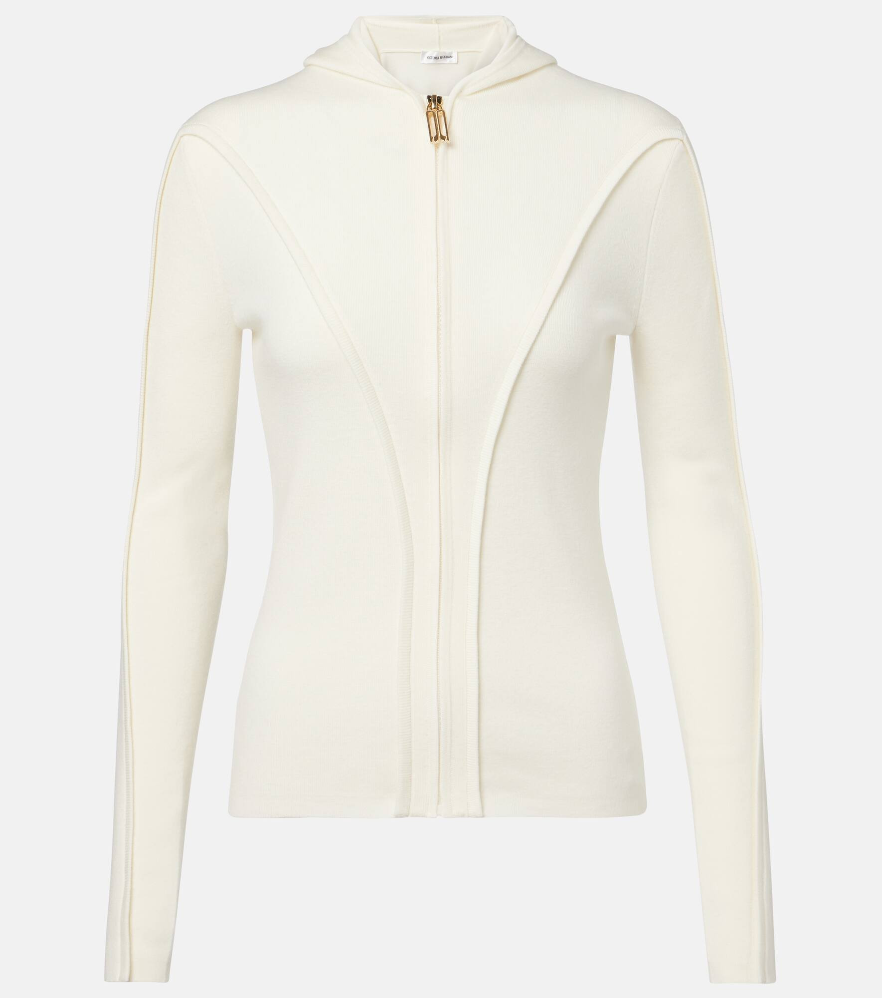 Victoria Beckham's eponymous label centers around chicly understated styles to create a versatile wardrobe. Crafted from a soft wool-blend jersey, this fitted hoodie features a zip-up front with a golden toggle and raised piping for a sculptural element. Product Details - Material: 82% wool (merino wool), 16% polyamide, 2% elastane - Care instructions: dry clean - Made in China - Designer color name: Ivory - Item color: white - Item number: P01053757 Size & Fit - True to size - Fitted - Stretchy fabric - Falls to the hip - The model seen in the picture is 178cm-5'10" and wearing a size XS