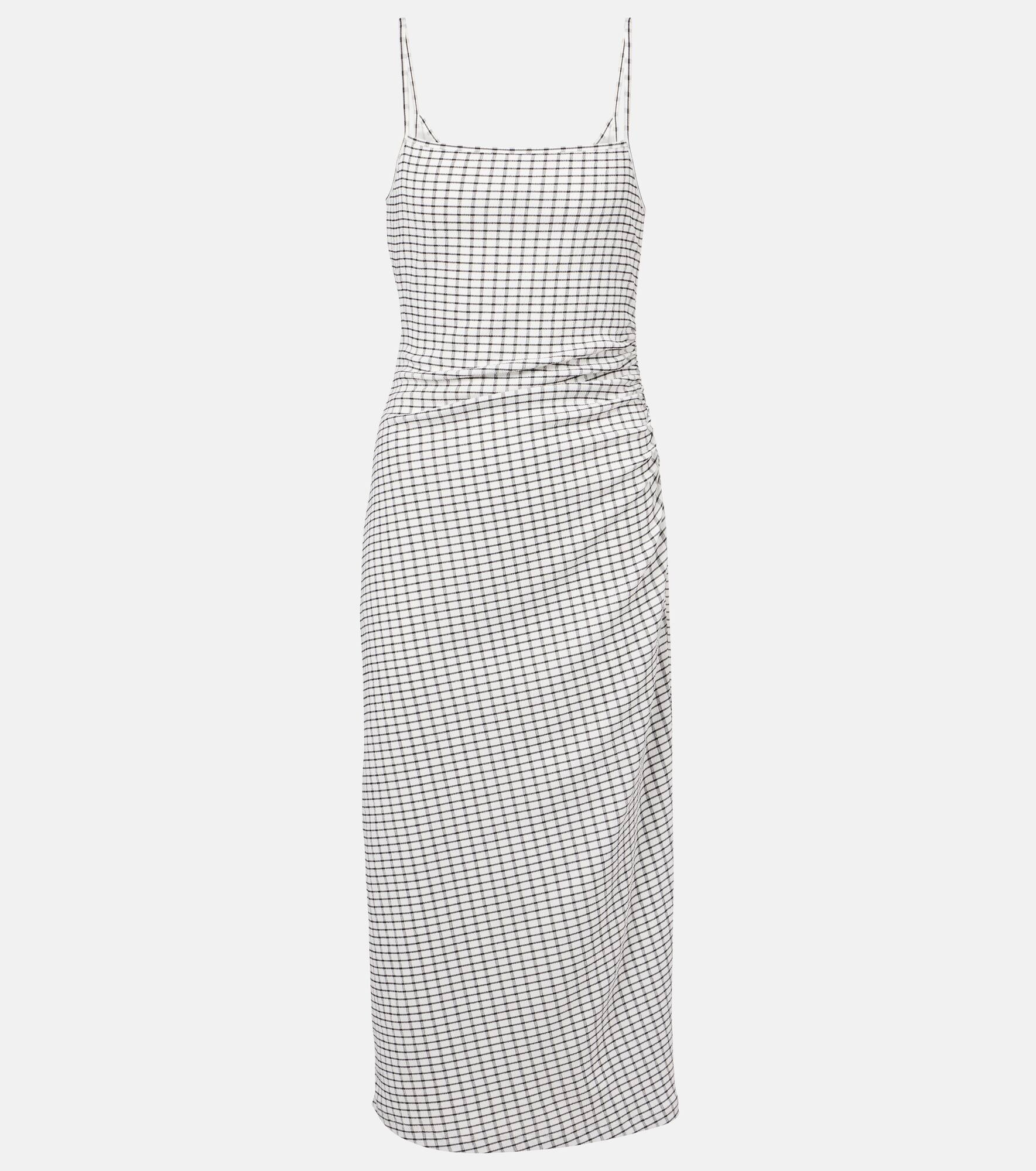 This midi dress from Vince is ruched along one side and features a check pattern. The lightweight, flexible fabric and inner lining ensure comfort and a flattering fit. Product Details - Material: 98% polyester, 2% elastane - Care instructions: hand wash - Made in China - Designer color name: Black Combo - Item color: white - Slim fit - Hem: straight - Item number: P01058917 Size & Fit - True to size - Fitted - Stretchy fabric - The model seen in the picture is 178cm-5'10" and wearing a size XS