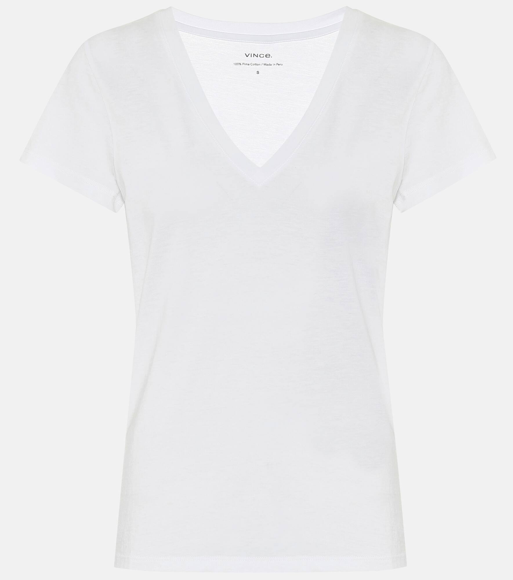 Presenting pieces such as this white T-shirt, Vince is the purveyor of your ultimate wardrobe staples. Made from lightweight cotton-jersey that rests softly against the skin, it’s cut to a body-skimming silhouette with a V-neckline. We're envisioning it tucked into white linen palazzo pants. Product Details - Care instructions: machine wash cold - Material: 100% pima cotton - Designer color name: Optic White - Item number: P00484213 Size & Fit - True to size - Straight fit - Lightweight material - Falls to the hip - The model seen in the picture is 178cm-5'10" and wearing a size XS