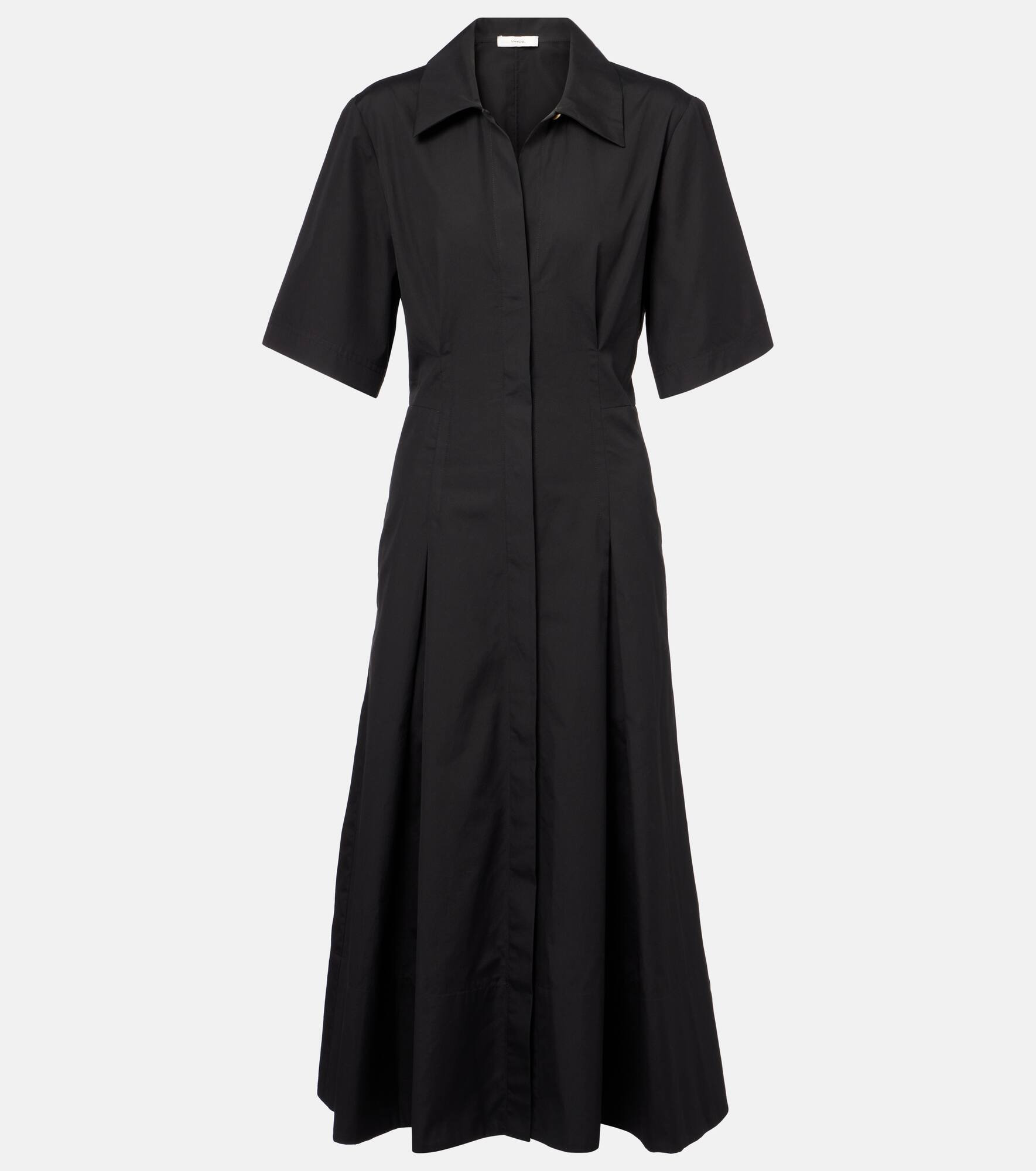 This cotton midi dress features a pointed collar, short sleeves, and concealed front buttons with soft pleats. Look to Vince when building a timeless wardrobe of elevated yet understated styles. Product Details - Material: 100% cotton - Care instructions: machine wash cold - Made in China - Designer color name: Black - Item color: black - Item number: P01058948 Size & Fit - True to size - Cinched waist - Non-stretchy fabric - The model seen in the picture is 178cm-5'10" and wearing a size XS