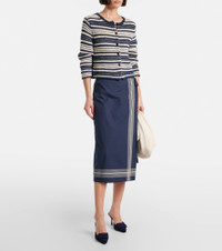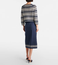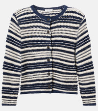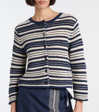 Pleasantly tactile with a classic edge, this open-knit striped cardigan from Vince is made of pure cotton. The garment is the ideal length for pairing with high-rise pants or skirts. Product Details - Material: 100% cotton - Care instructions: hand wash - Made in China - Designer color name: Navy/off white - Item color: blue, white - Regular fit - Length: short (waist-length) - Sleeves: ¾ length - Closure: buttoned front - Collar: crewneck - Hem: straight - Item number: P01058925