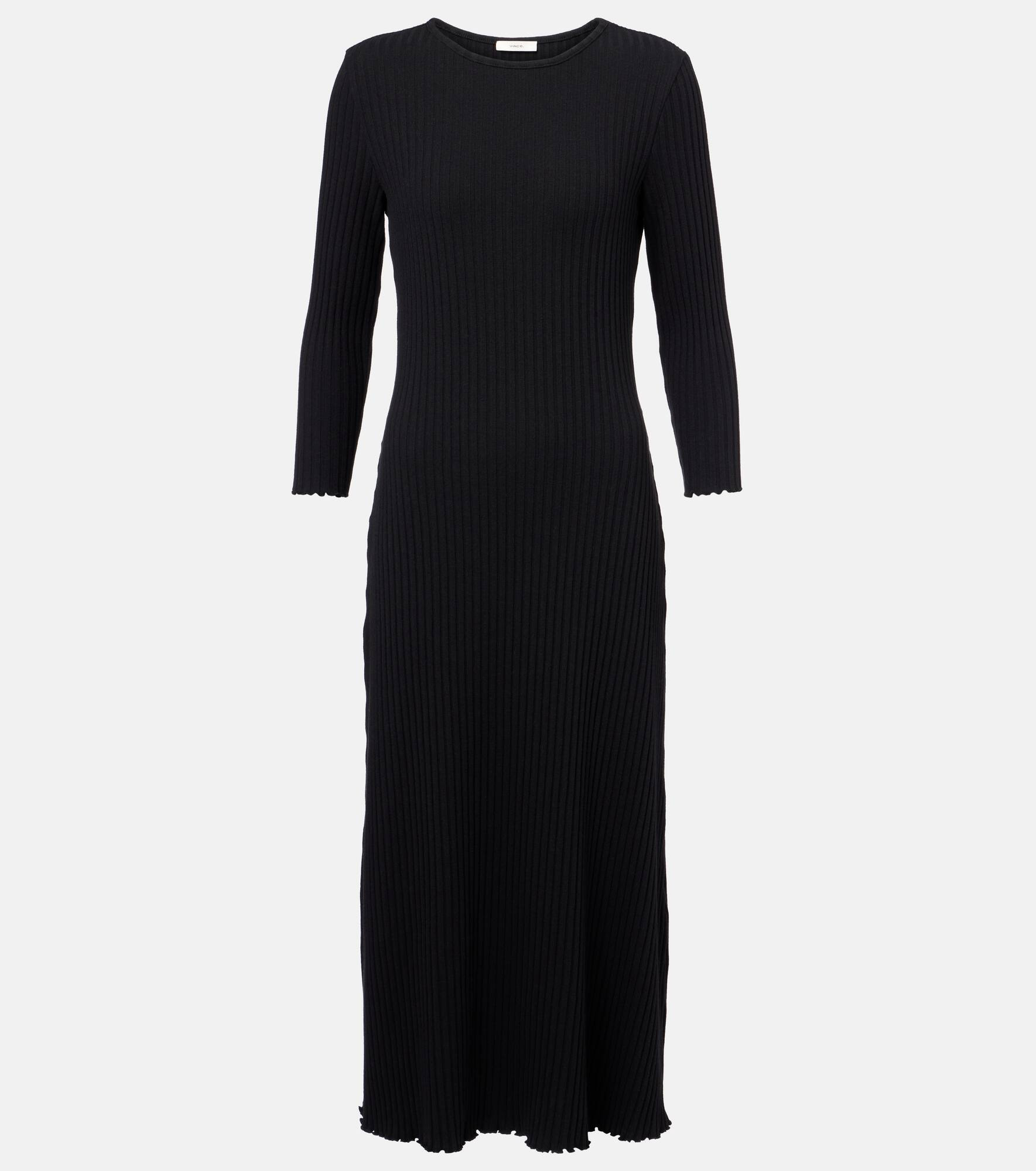 Vince's classic ribbed dress is finished with subtle frilled hems and a crewneck. The flattering vertical cut of this garment is designed to enhance and elongate your silhouette. Product Details - Material: 79% cotton, 19% polyester, 2% elastane - Care instructions: hand wash - Made in China - Designer color name: Black - Item color: black - Collar: crewneck - Slim fit - Cuff: frilled - Hem: straight - Sleeves: long-sleeved - Item number: P01058881 Size & Fit - True to size - For a closer fit, we recommend taking one size down - Straight fit - Stretchy fabric - The model seen in the picture is 178cm-5'10" and wearing a size XS