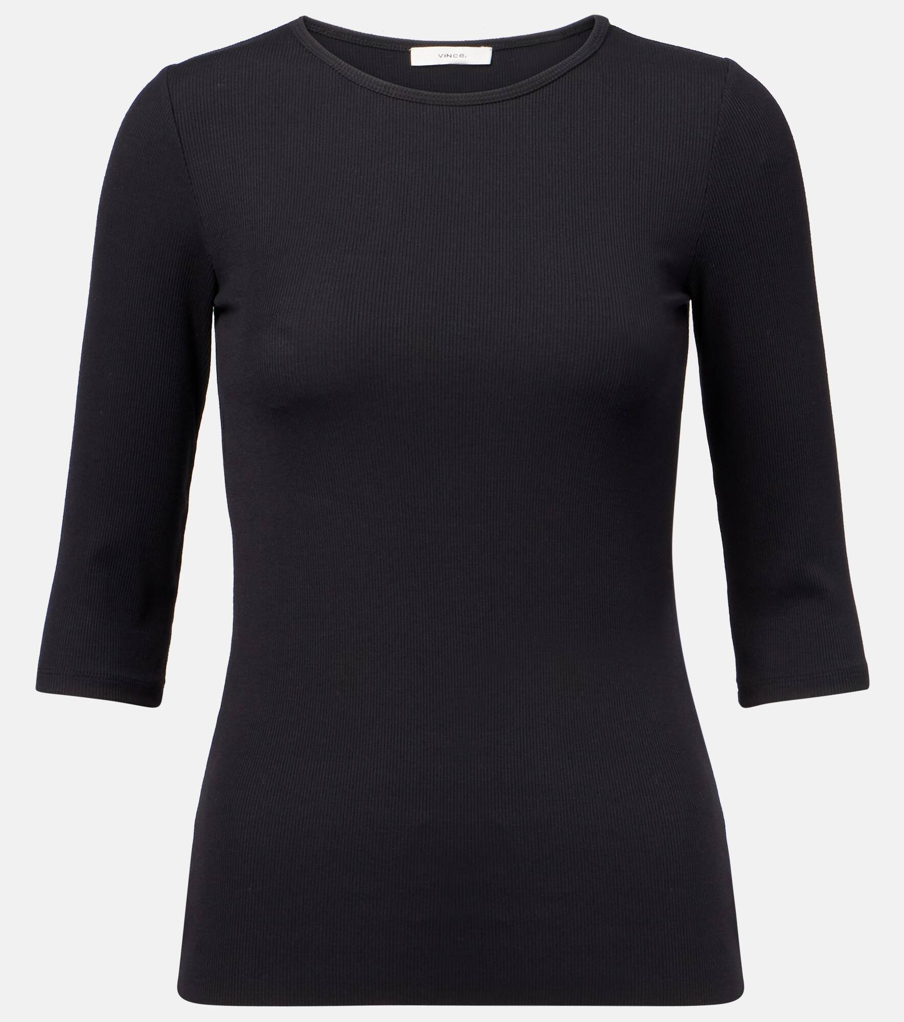 This ribbed-knit top features three-quarter sleeves and a fine, lightweight handle. Perfect for layering or wearing solo. Look to Vince when building a timeless wardrobe of elevated yet understated styles. Product Details - Material: 85% modal, 15% elastane - Care instructions: machine wash cold - Made in China - Designer color name: Black - Item color: black - Item number: P01058960 Size & Fit - True to size - Cinched waist - Stretchy fabric - Falls to the hip - The model seen in the picture is 178cm-5'10" and wearing a size XS