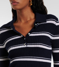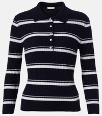 Product Details - Material: 85% cashmere, 13% silk, 1% nylon, 1% elastane - Care instructions: dry clean - Made in China - Designer color name: Coastal/ Off White - Trim: 86% cashmere, 14% silk - Closure: partially buttoned front - Collar: polo collar - Item number: P01010963 Size & Fit - True to size - Fitted - Stretchy fabric - Falls to the hip - The model seen in the picture is 178cm-5'10" and wearing a size XS